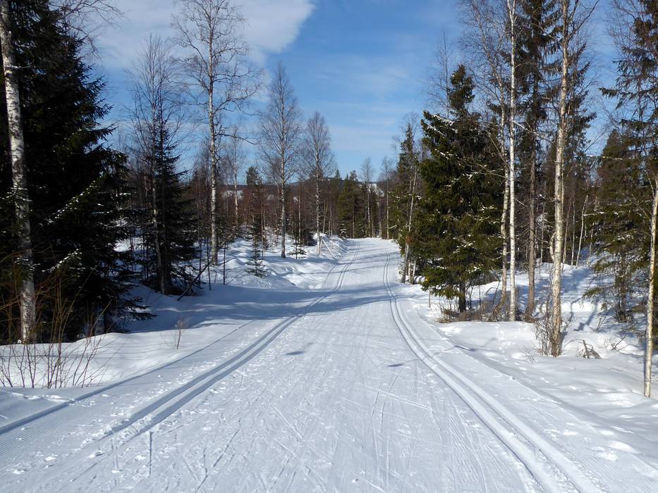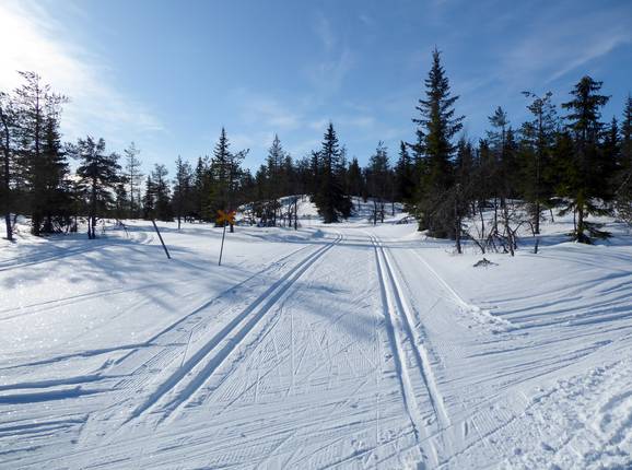 Kläppens schönste Loipe startet an der Bergstation der Gondelbahn und führt über den Gipfel entlang. Es gibt einen Anschluss zur Bergspåret Loipe.