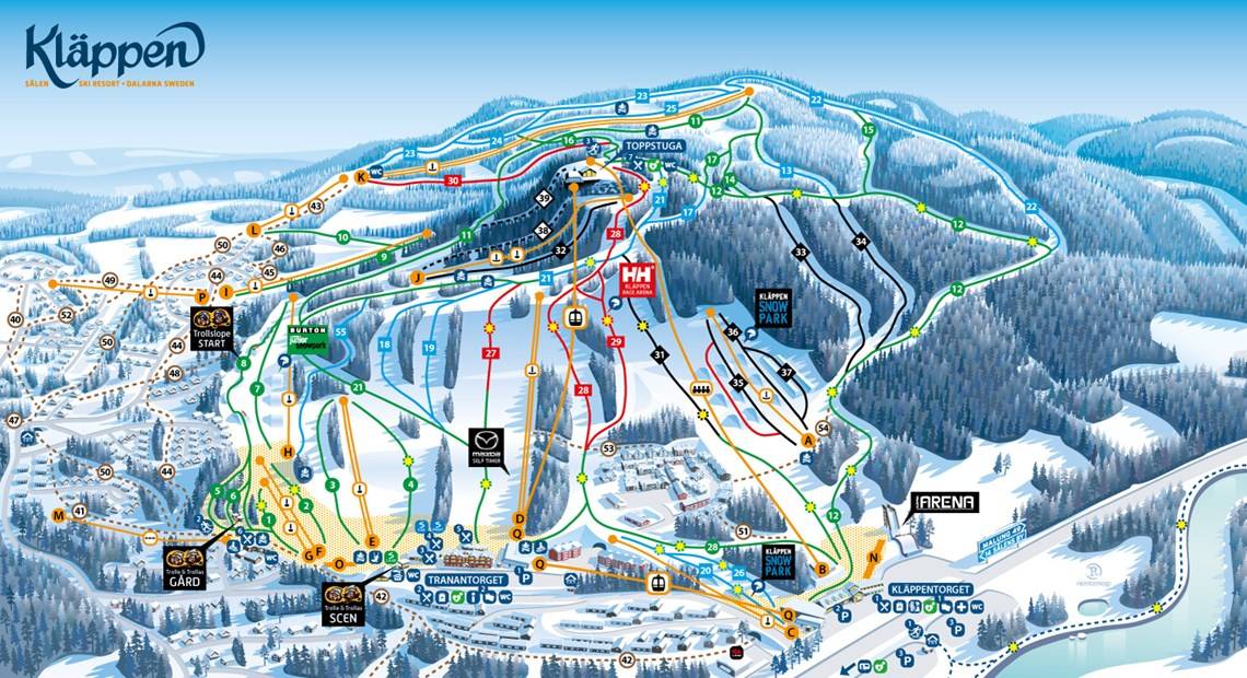 Der Pistenplan bildet das Skigebiet Kläppen in Sälen sehr gut ab. Es sind sämtliche Lifte, Pisten, Attraktionen, Einkehrmöglichkeiten und Parkplätze eingezeichnet. Es gibt sogar einen eigenen Pistenplan für die Kinderbereiche.