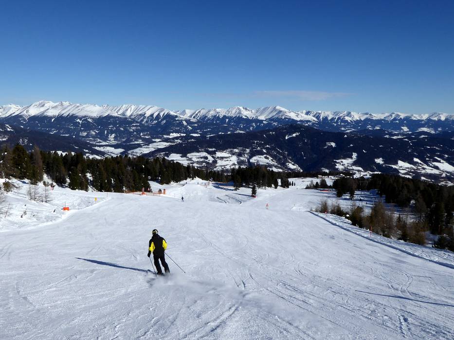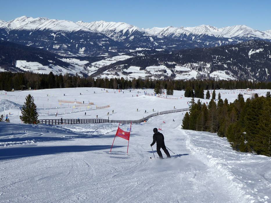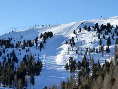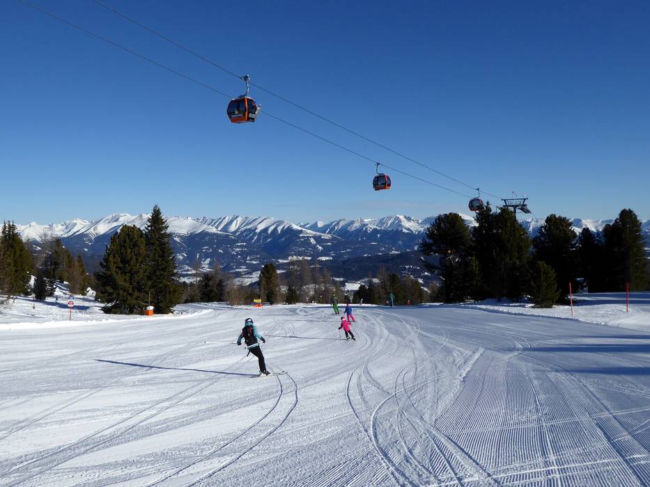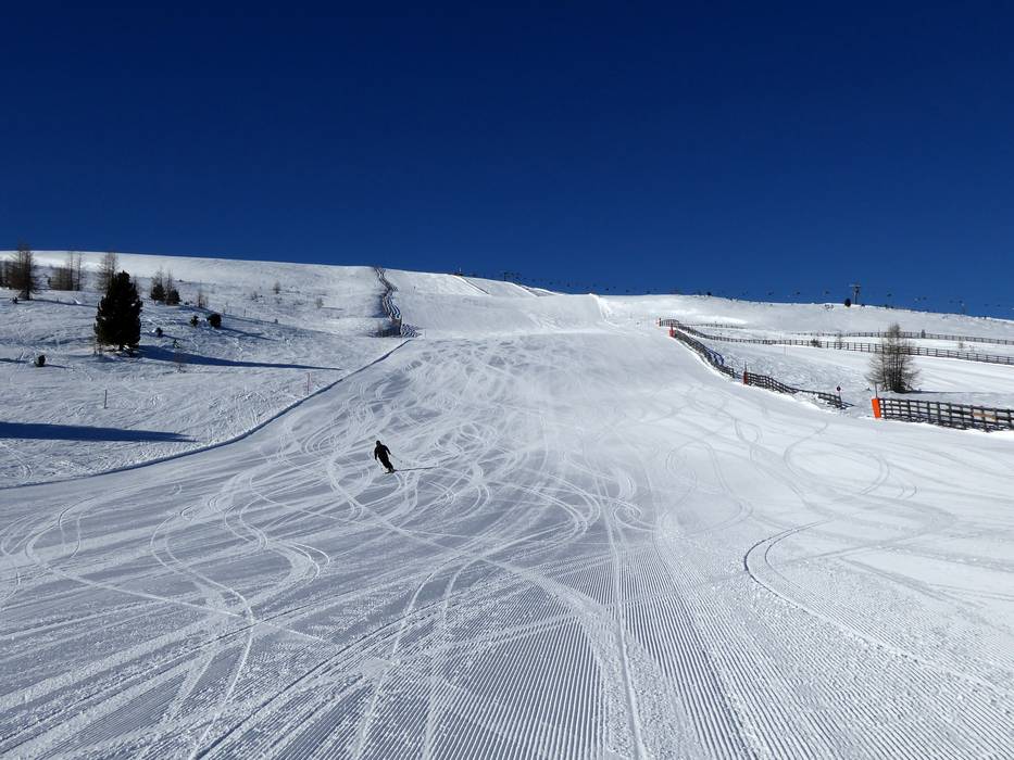Die mittelschwere Piste 9 verläuft im oberen Bereich über der Baumgrenze und bietet einen tollen Blick auf die umliegende Landschaft. Im unteren Teil schlängelt sie sich durch den für das Skigebiet typischen Zirbenwald. - Piste 5