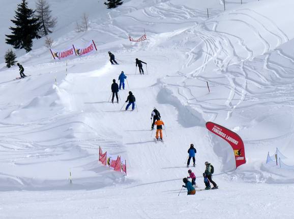Im Skigebiet Ladurns gibt es keinen klassischen Snowpark, aber einen Funcross, eine Funslope und eine Speedmessstrecke.