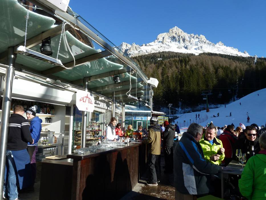 Bevor es mit der Gondelbahn ins Tal nach Predazzo geht, kann man in der Baita Gardoné unter (künstlichen) Palmen im Liegestuhl die Sonne genießen oder in der Schirmbar feiern.