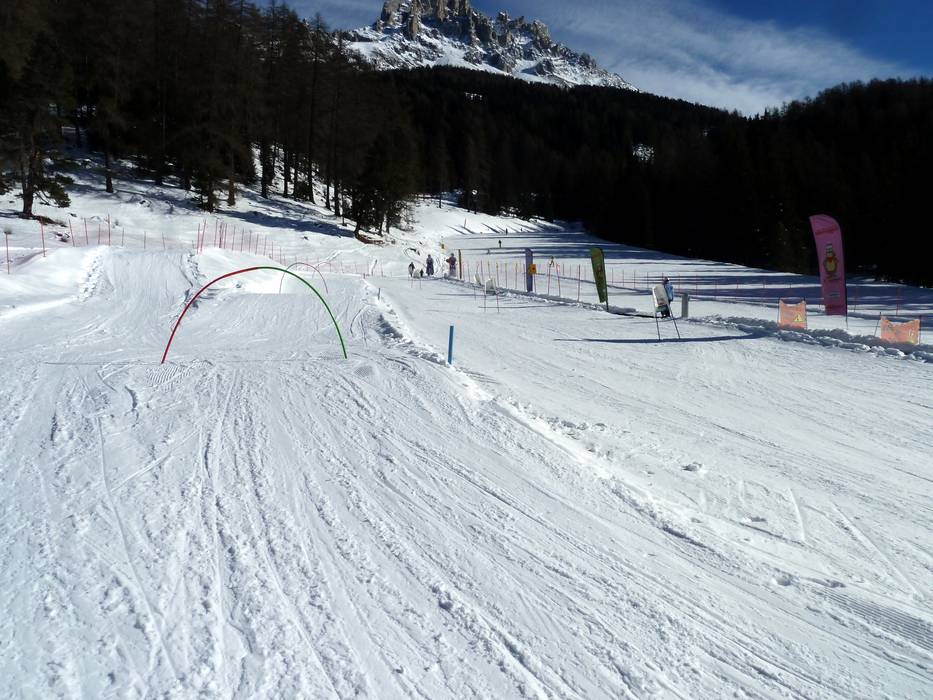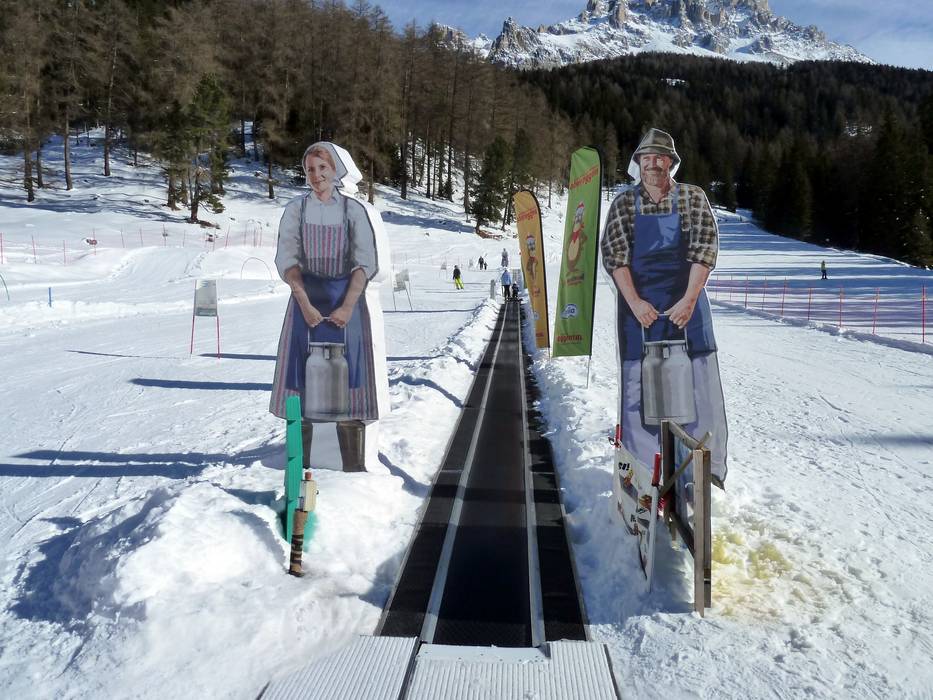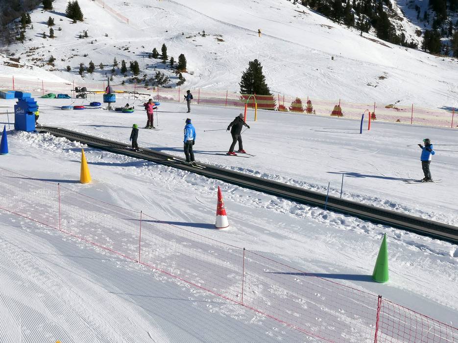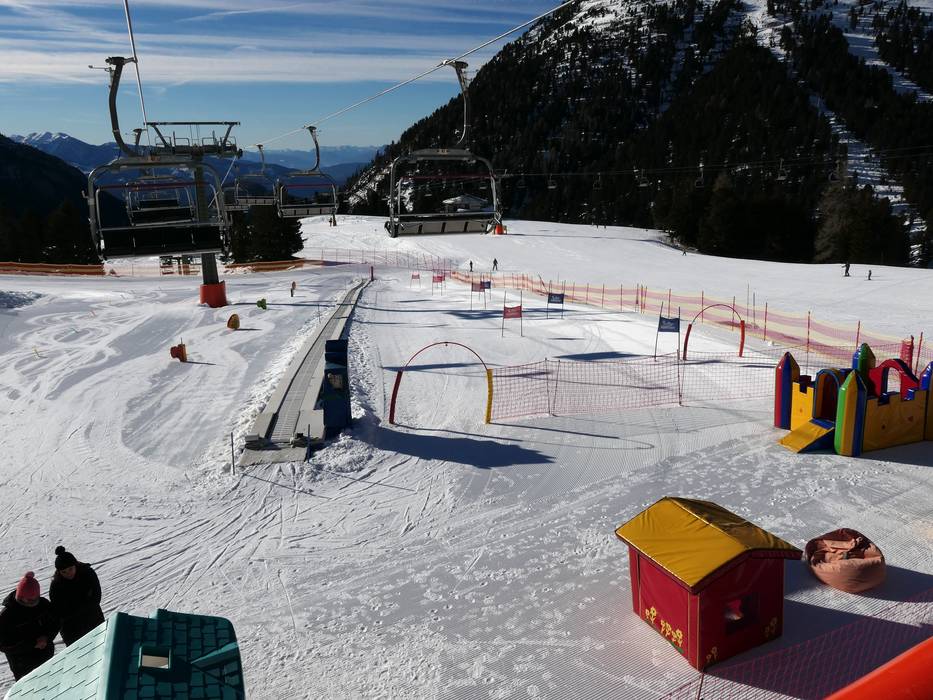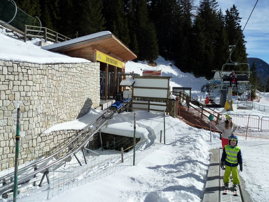 An der Bergstation der Gondelbahn von Predazzo gibt es einen betreuten Kindergarten mit Förderband und Kinderpiste.