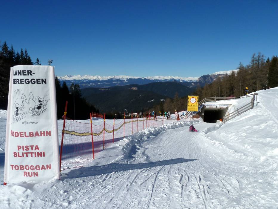 In Obereggen bringen zwei Rodelbahnen Schneespaß auf Kufen. Die lange Rodelbahn "Obereggen" über 2,5 km führt entlang der Gondelbahn Ochsenweide und bietet auch Flutlichtbeleuchtung. An der Bergstation der Gondelbahn Ochsenweide startet auch die einfache Rodelbahn "Absam". Mit 750 m Länge wird sie von der Kombibahn Laner (Sessel und Gondel) bedient. Einkehrmöglichkeiten sind in der Epircher-Laner Alm, in der Absam Stube sowie im Tal in Obereggen vorhanden. An der Bergstation in Predazzo bei Gardoné gibt es eine weitere Rodelbahn mit 500 m Länge an der Sesselbahn Campo Scuola Gardoné. Zudem eine weitere in Pampeago an der Bergstation des Sessellifts Latermar mit 400 m Länge.