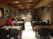 Mitten im Skigebiet gelegen, ist es genau so gut für einen schnellen Espresso wie für ein ausgiebiges Mittagessen mit Wein geeignet. Bei Sonne auf der aussichtsreichen Terrasse und ansonsten im kamingeheizten Inneren mit seinen 49 Sitzplätzen.