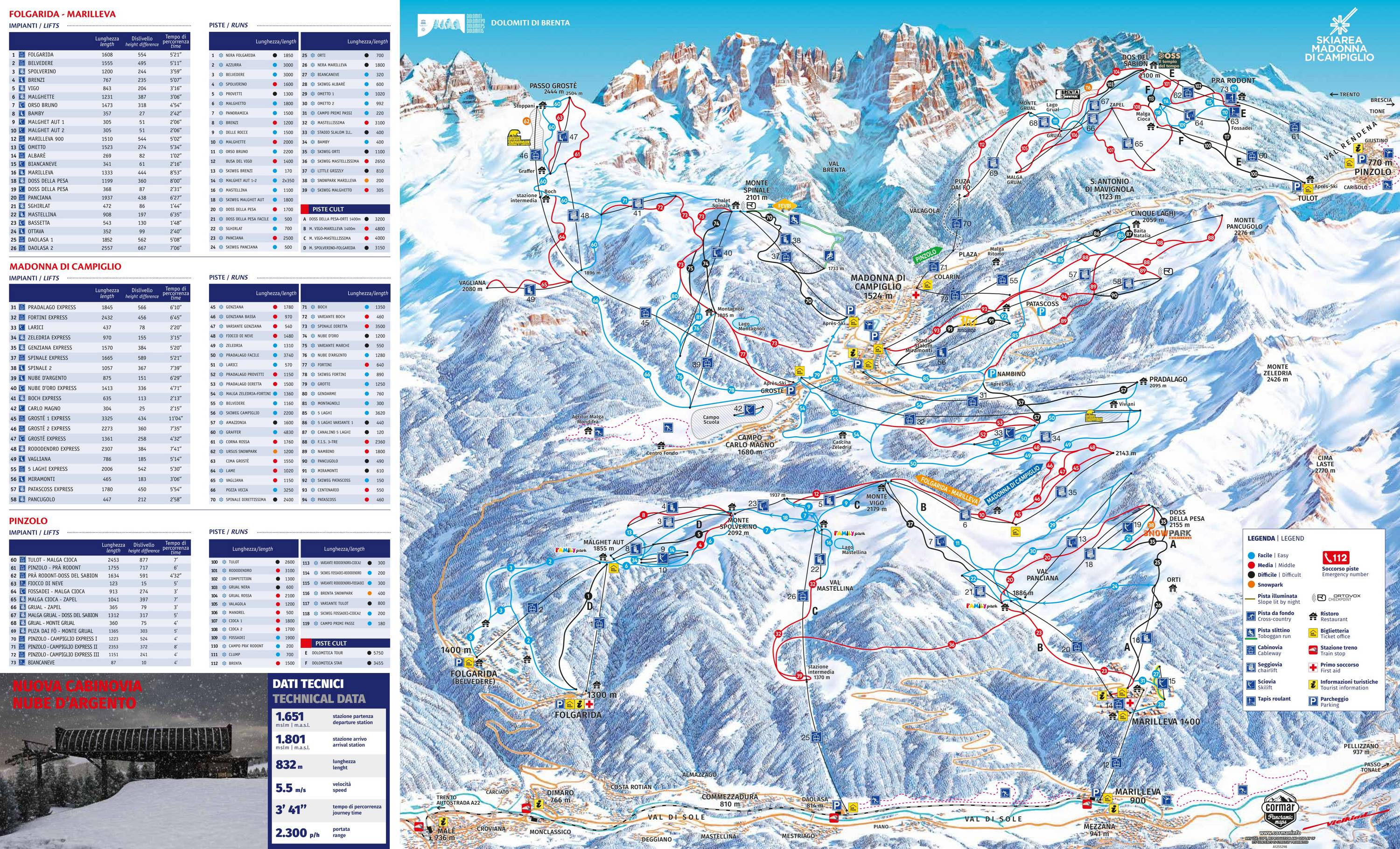 Der Pistenplan bildet das gesamte Skigebiet Campiglio Dolomiti di Brenta (Folgàrida/Marilléva/Madonna di Campiglio/Pinzolo) sehr gut ab. Alle Lifte und Abfahrten sind im Detail beschrieben. Die Snowparks, Hütten und weitere Informationen sind vorbildlich beschrieben.