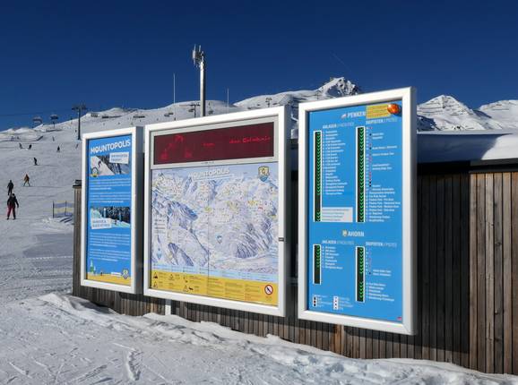 Der Pistenplan ist übersichtlich gestaltet. Alle wichtigen Punkte wie Hütten, Highlights und Erlebnisse, Bushaltestellen und Parkmöglichkeiten sind verzeichnet. Alle Mountopolis Erlebnisse sind hervorragend beschrieben. Außerdem sind im Faltblatt mehrere interessante Routen durch das Skigebiet erklärt. An manchen Stellen ist es schwierig, die Gefällerichtung einer Abfahrt zu erkennen. Besonders bei Verbindungsstücken führt dies zu etwas Verwirrung.