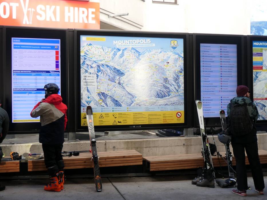 Orientierung (Pistenplan, Informationstafeln, Ausschilderung) und Sicherheit im Skigebiet Mayrhofen – Penken/​Ahorn/​Rastkogel/​Eggalm (Mountopolis)