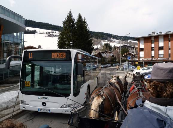 - Neben den Skibussen werden auch Kutschen eingesetzt, um die Gäste in Megève zu transportieren.