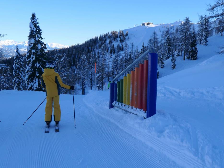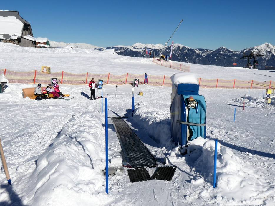 Das Kinderland der Skischule DieSkischule.at liegt bei der Passhöhe Passo Pramollo bei der Sonnenalpe Nassfeld. Am Förderband und mit lustigen Figuren fällt das Lernen leicht.