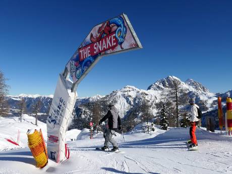 Auf der Erlebnispiste „The Snake" kann man sich auf Wellen, Sprünge, Steilkurven, Boxen und eine Schnecke mit Schneetunnel freuen.