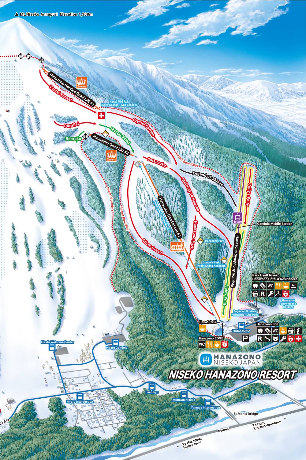 Der Pistenplan bildet das komplette Skigebiet Niseko United sehr gut ab. Jede Piste ist mit Neigung und Länge im Detail angegeben. Ebenso gibt es Informationen zu jedem der Skilifte. Für jedes Teilgebiet sind einzelne Pistenpläne erhältlich. Man erkennt u.a. auch welche Pisten zum Nachtskifahren geöffnet sind und welche Abfahrten Buckelpisten sind. Es gibt eigene Pistenpläne in japanischer und englischer Sprache. Auf der Rückseite findet man weitere nützliche Informationen zu den Saisonzeiten der einzelnen Teilgebiete und den Fahrplan des Niseko United Shuttle Busses.