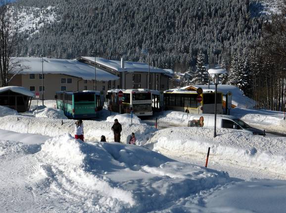 Der nächstgelegene Bahnhof befindet sich in Sonthofen und ist ca. 15 km entfernt. Von Sonthofen aus fahren zwischen 06:00 und 17:30 alle 30-60 Minuten Busse nach Oberjoch. - Umfangreiches Skibusnetz