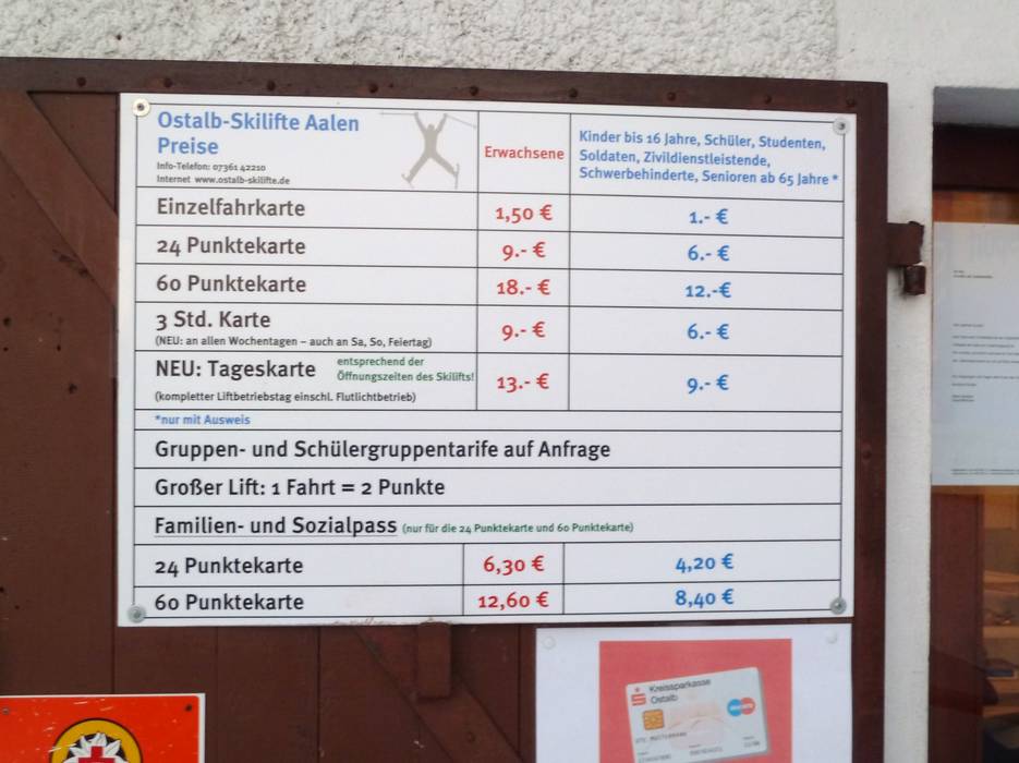 | Hinweis: Die Öffnungszeiten sind generelle Angaben vom Skigebiet Ostalb – Aalen und können je nach äußeren Bedingungen, Wochentagen, Schulferien und Feiertagen variieren. | |