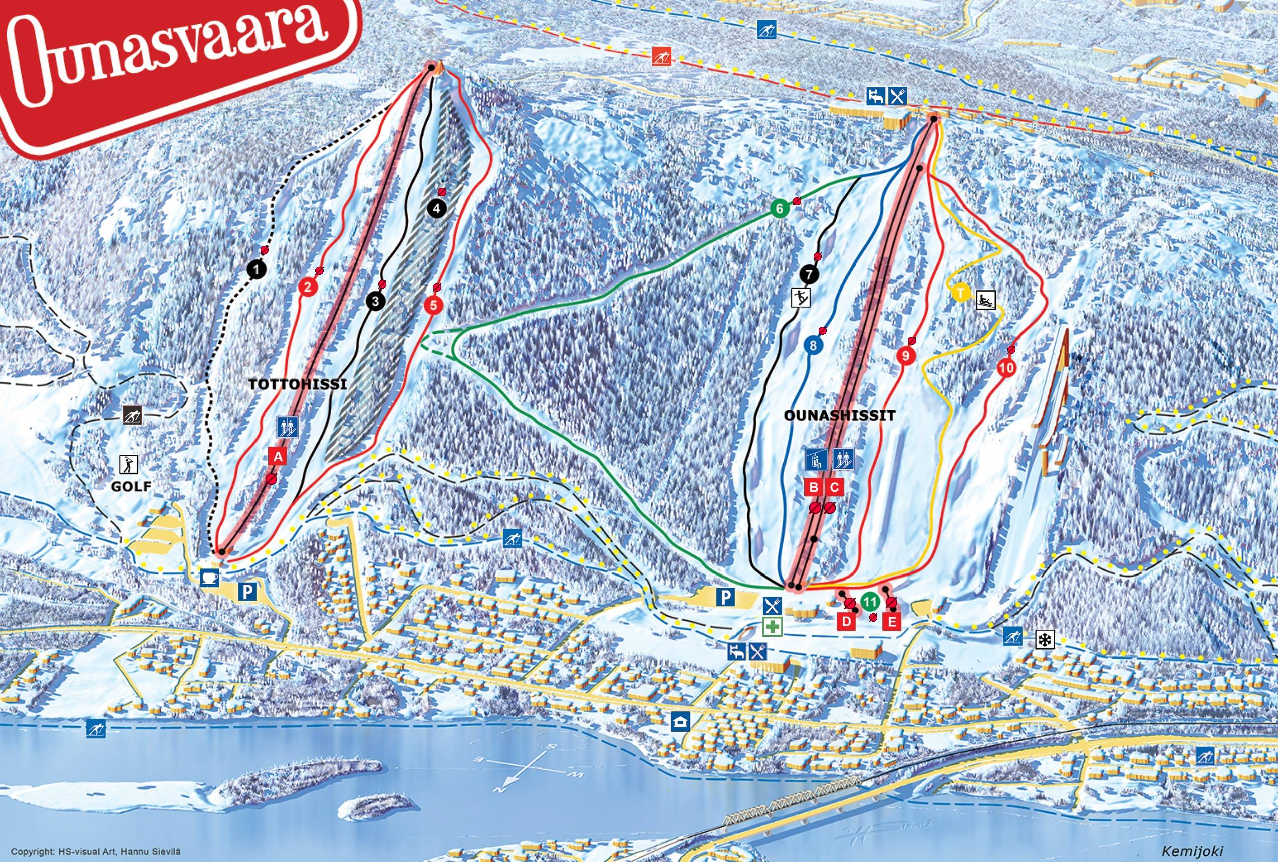Der Pistenplan bildet das Skigebiet Ounasvaara mit allen Liften und Pisten gut ab.