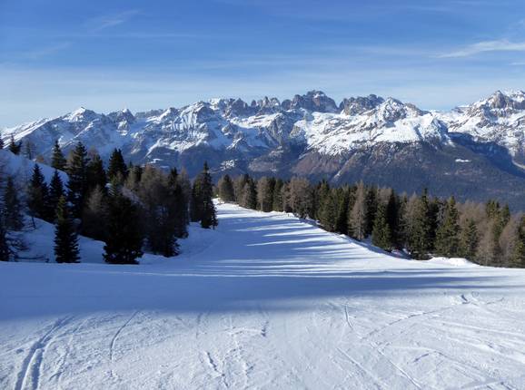 Die breiten und bestens präparierten Pisten des Skigebiets Paganella gehören zum internationalen Spitzenniveau. Der Großteil der Pisten ist mittelschwer und führt über freies Skigelände im oberen Bereich. Weiter unten führen die Pisten durch Waldschneisen zu Tale. Es gibt eine schwere Piste und einige leichte Pisten für die Anfänger. Bei den meisten Abfahrten hat man das herrliche Panorama der Dolomiten vor sich. Vom Gipfel kann man sogar den Gardasee sehen.