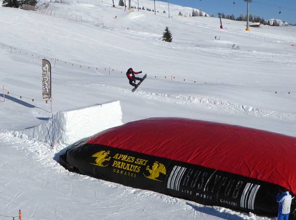 Der SanPe Snowpark befindet sich in sonniger Lage an der Sesselbahn Campigol beim Passo San Pellegriono. Es gibt 3 Lines von Easy über Medium bis Pro. Highlight ist der Big Air Bag. Das Luftkissen ermöglicht eine sanfte Landung.