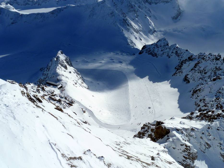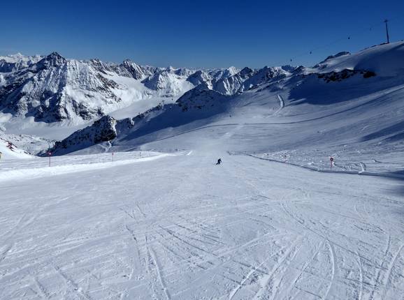Es gibt keine Talabfahrt. Man muss am Ende des Skitages mit der Standseilbahn Gletscherexpress wieder zu Tale fahren.