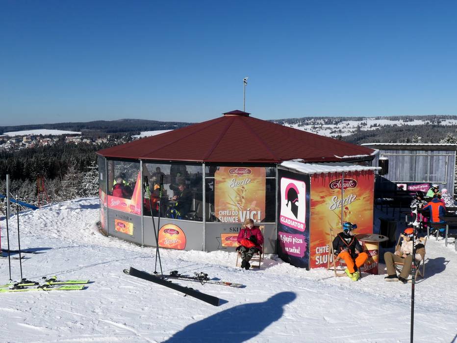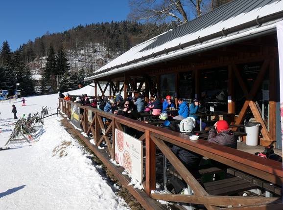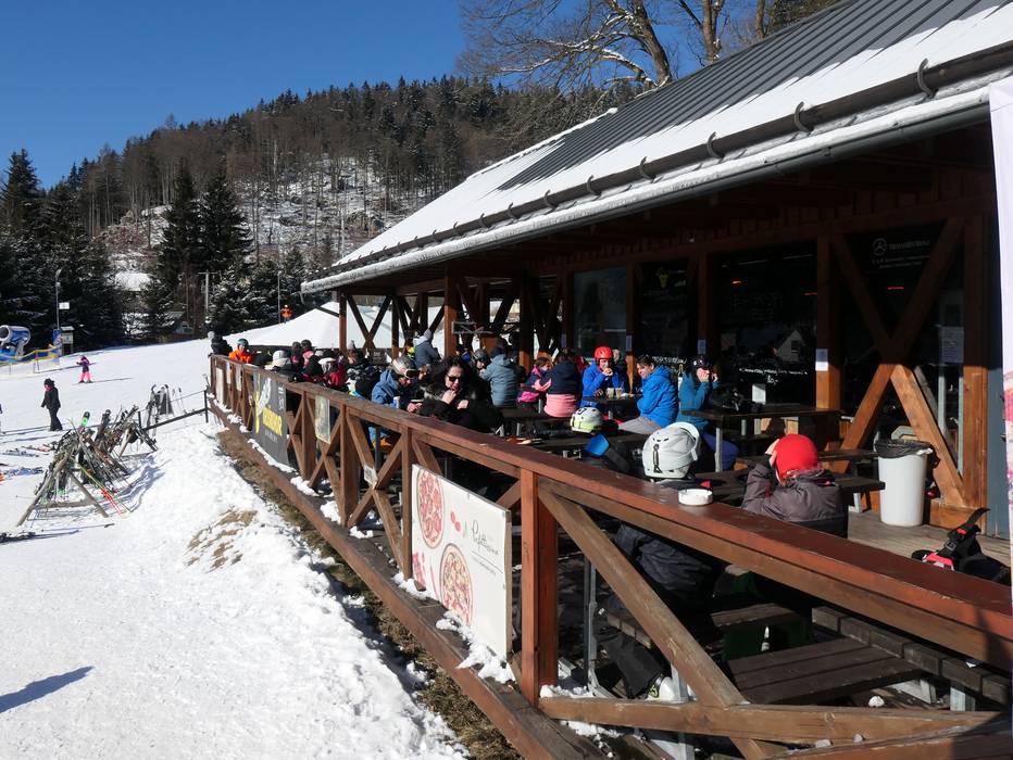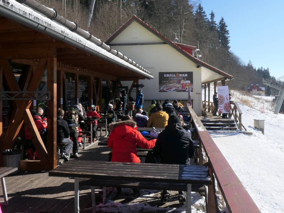 Das Après-Ski & Grill U Dostyho hat eine schöne Terrasse und ist ideal für das gemütliche Après-Ski. Verschiedene Getränke und Grill-Gerichte werden angeboten.