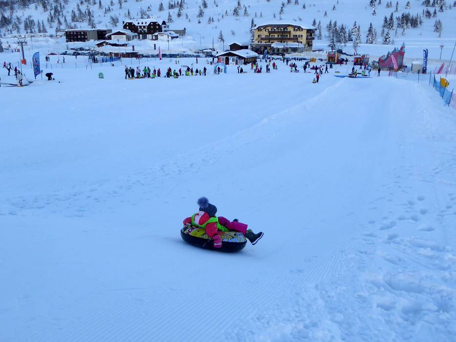 Snow Tubing ist ein großer Spaß. Die Strecke befindet sich am Passo Tonale beim La Baracca.