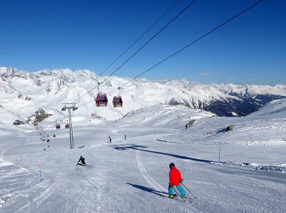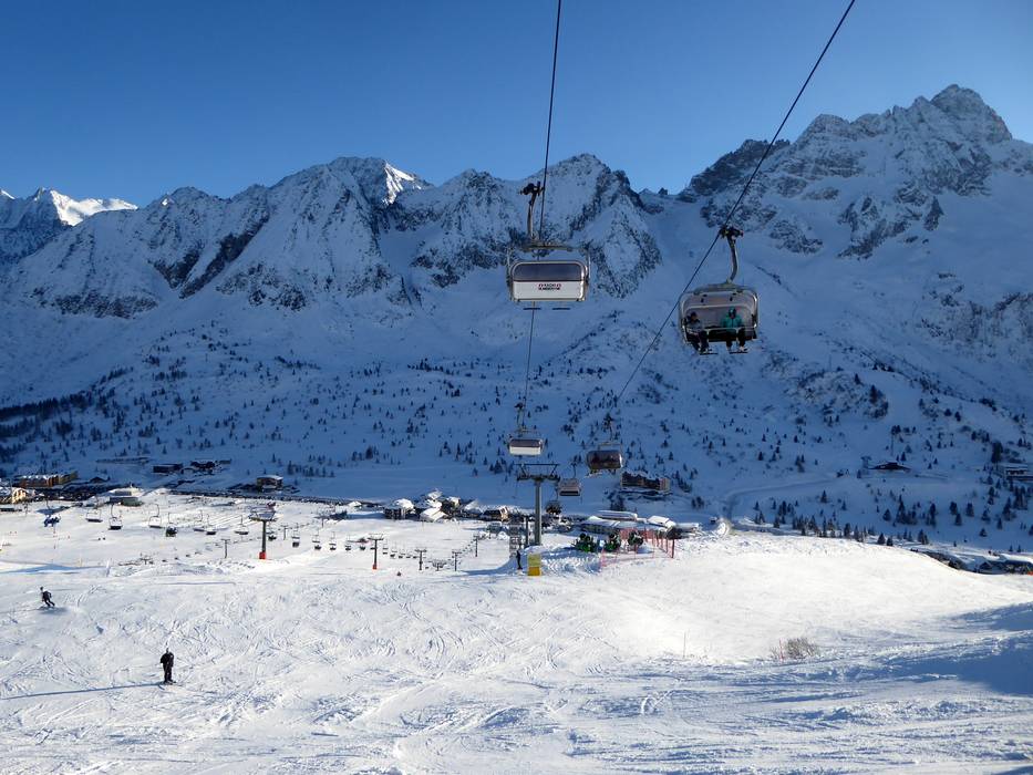 Panorama auf 3.000 m am Passo Presena Waldschneisenabfahrten zwischen Ponte di Legno… Eine typische Vierersesselbahnen im Skigebiet Panorama auf 3.000 m am Passo Presena