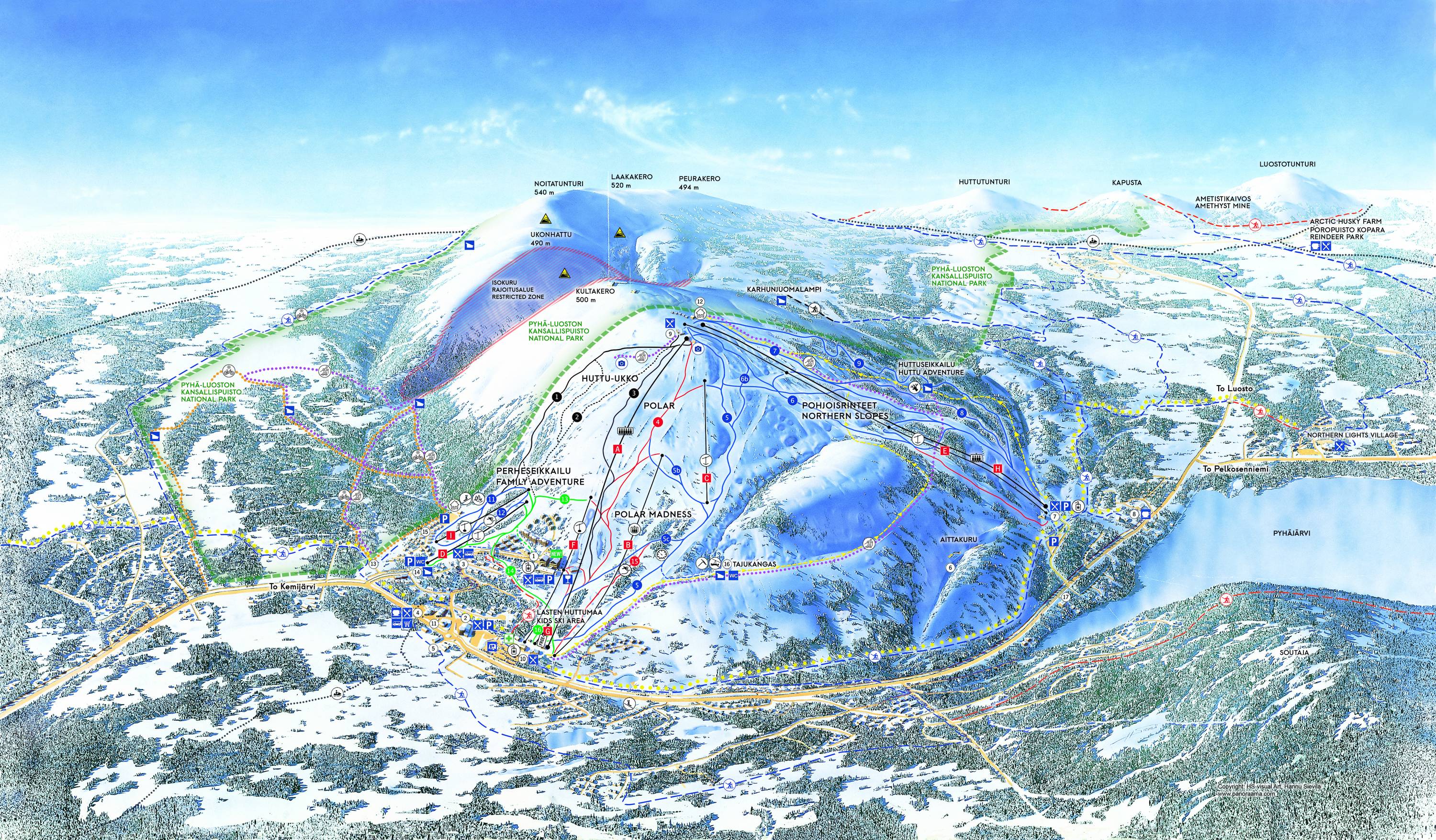 Der Pistenplan stellt das Skigebiet Pyhä und Luosto sehr gut dar. Es sind alle Lifte und Pisten eingezeichnet. Zudem sind viele weitere Informationen angegeben. Einige Höhenangaben könnten ergänzt werden.