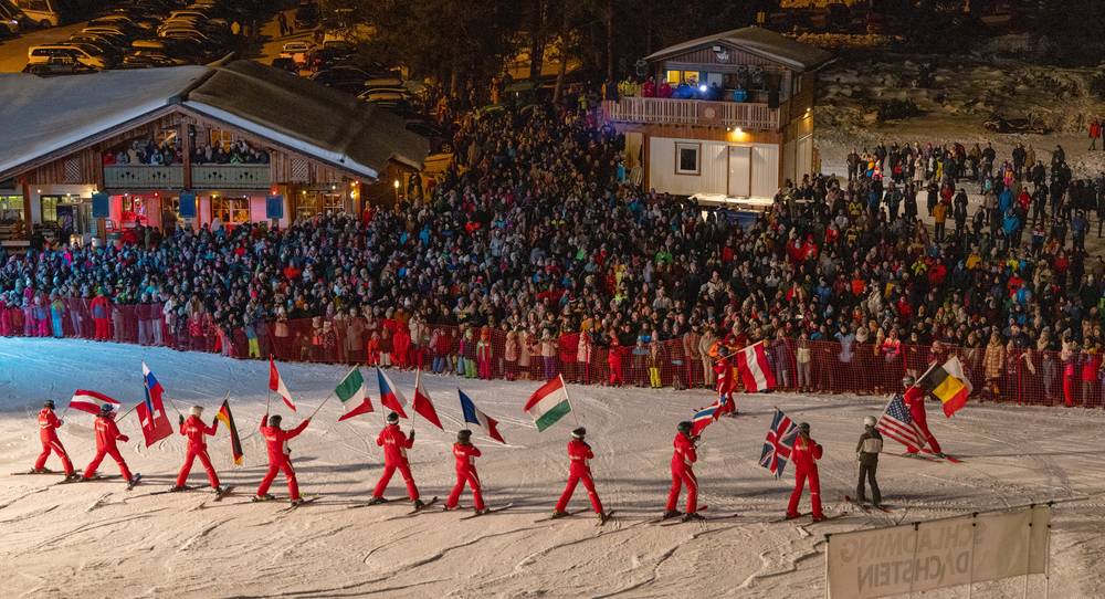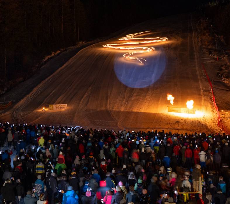 Ramsau am Dachstein begrüßt seine Gäste mit einem stimmungsvollen Begrüßungsschneefest. 60 bis 100 Akteure, großteils Skilehrerinnen und Skilehrer der Ramsauer Skischulen, bieten eine tolle Show und verzaubern die Gäste mit akrobatischen Einlagen am Rittisberg Nordhang.