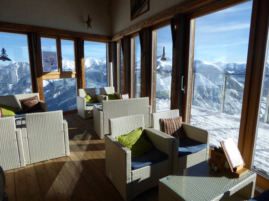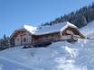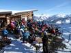 Die Sonnenterrasse mit Liegen bietet einen herrlichen Panoramablick übers Mörsbachtal. Die gemütliche Hütte garantiert einen gelungenen Einkehrschwung mit hausgemachten Hüttenspezialtäten und Après-Ski Hüttenzauber.