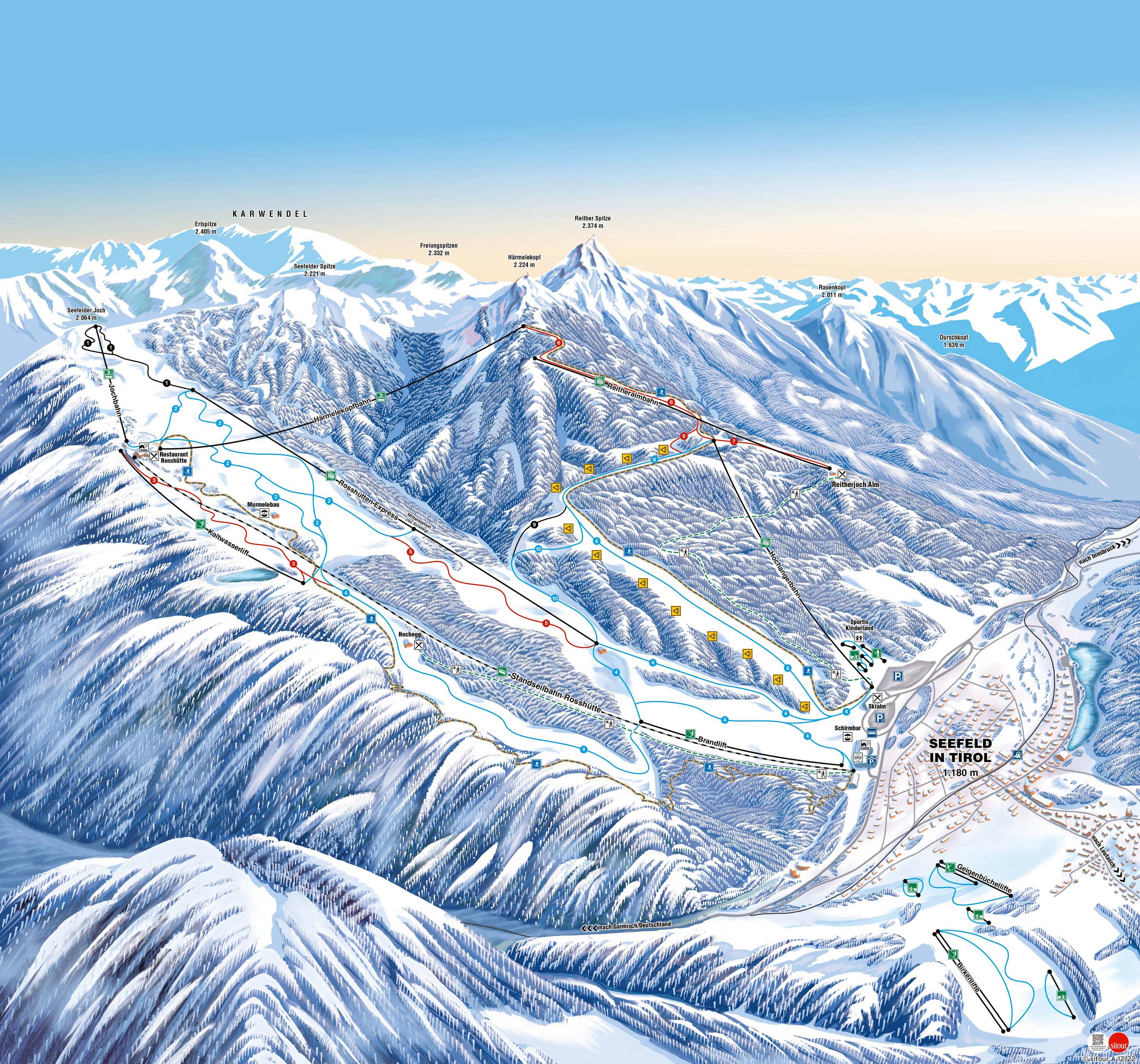 Der Faltplan des Skigebiets Seefeld/Rosshütte befindet sich in einem kleinen Heft mit Informationnen zu allen Seefelder Skigebieten. Wenn man die richtigen Seiten gefunden hat, ist er recht übersichtlich. Die Lifte, Pisten und Hütten sind eingezeichnet und im Heftchen erklärt. Es finden sich auch weitere Informationen zu Nachtskilauf, Preisen, Öffnungszeiten und Kontaktinformationen.