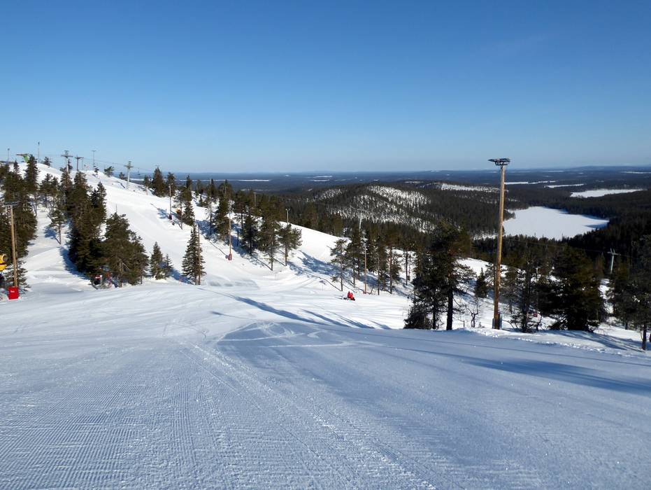 Panorama vom 492 m hohen Gipfel Blick über die Saarua-Pisten Blick über den gigantischen Snowpark Piste Pessari mit gleichnamigem See Front Slopes in Ruka Village