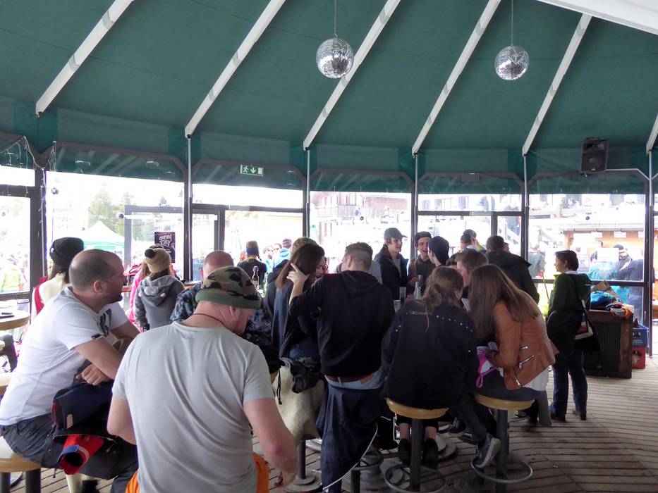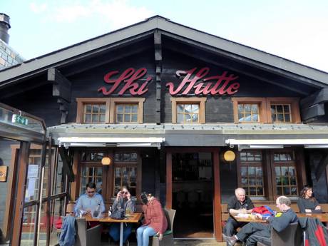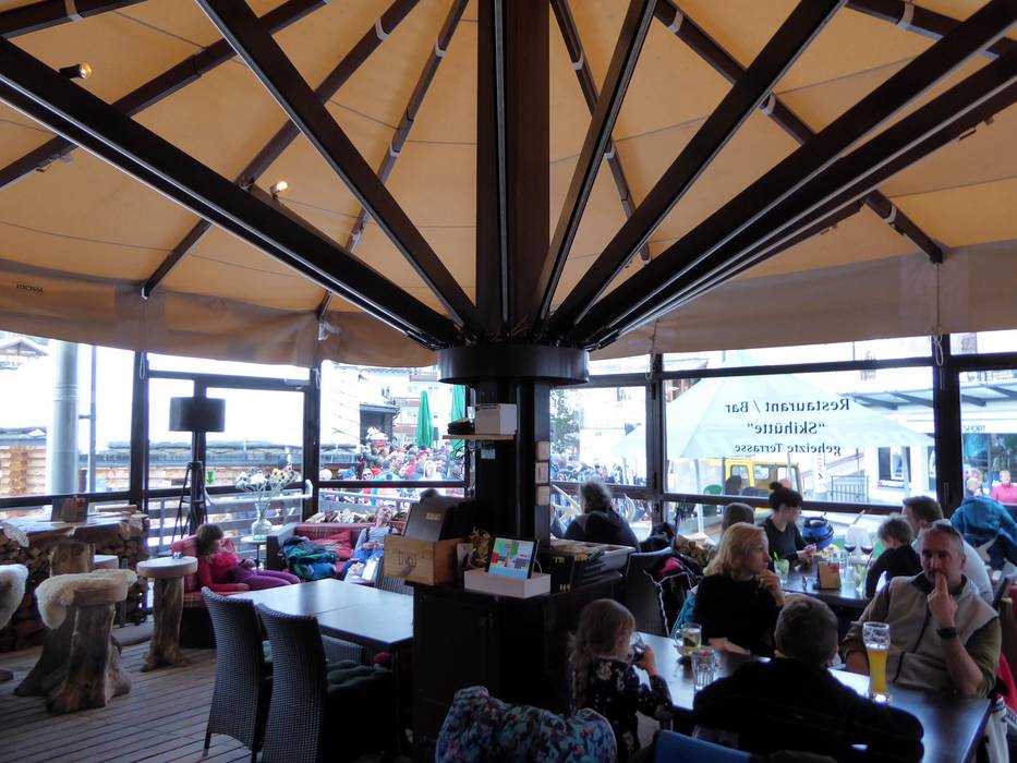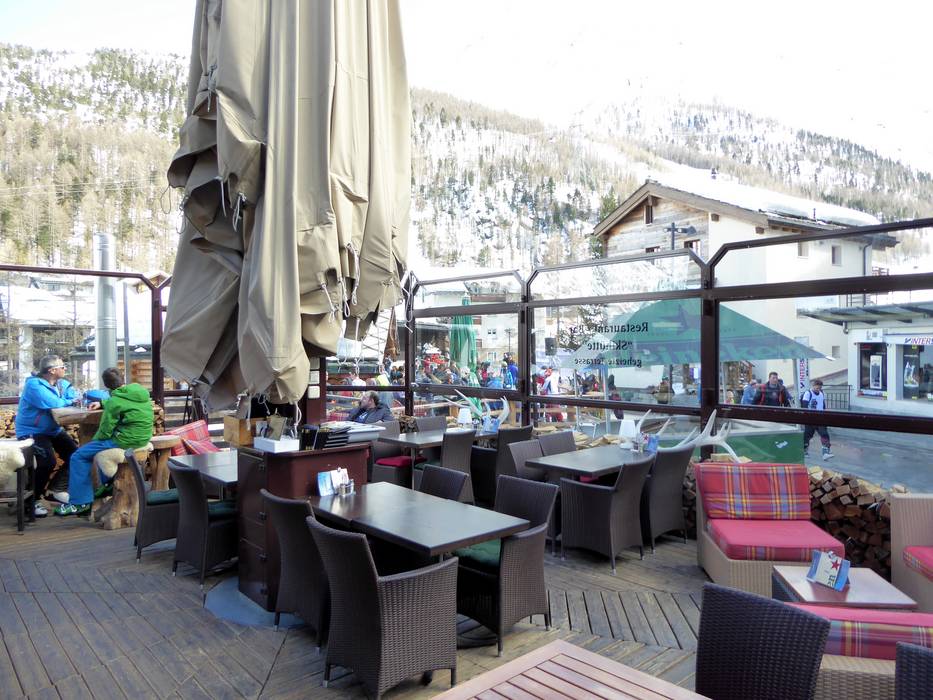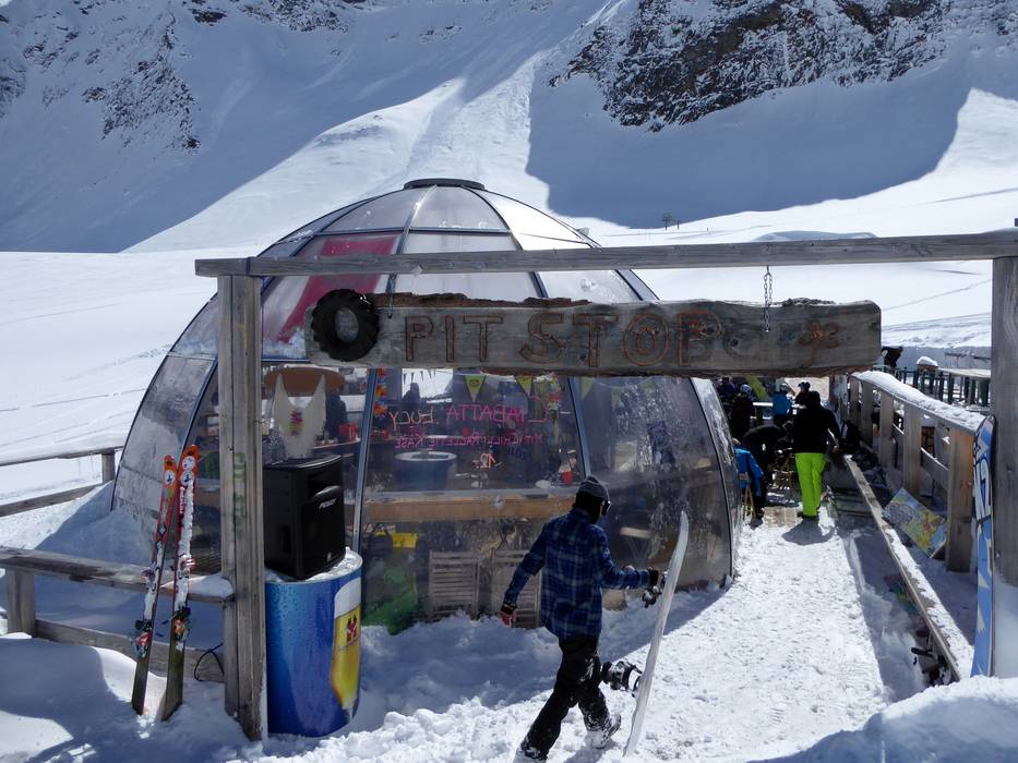 In der "Skihütte" lässt man den Skitag ganz gediegen ausklingen. Bei Fingerfood und Käsespezialitäten kann man ein Glas Wein genießen. Die Bar Lounge lädt zum Verweilen ein. Unter dem großen Schirm kann man bequem das Treiben in der Gletscherstraße beobachten.