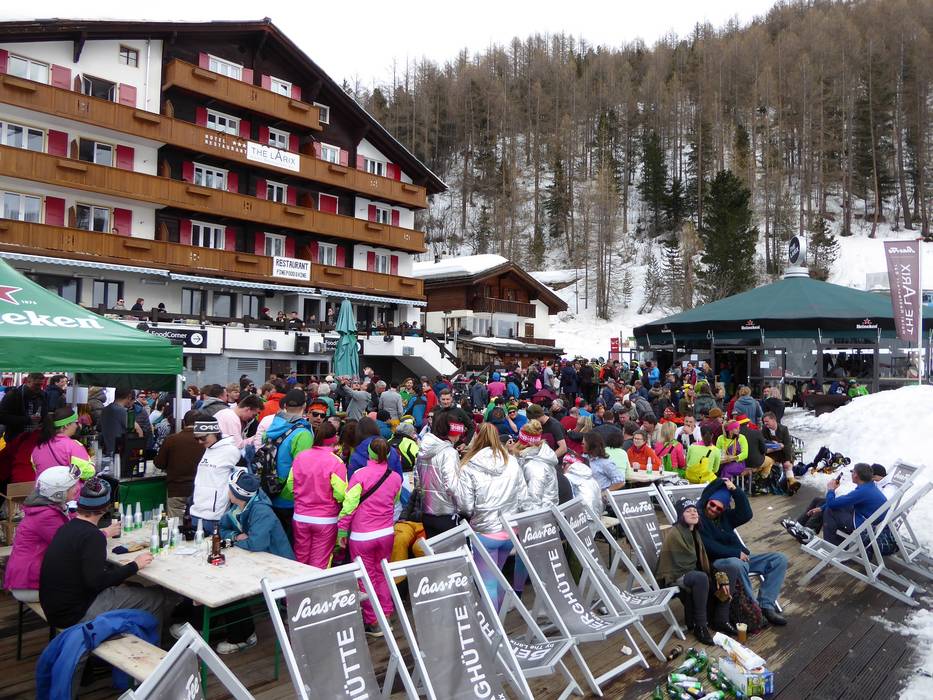 Nach einem erlebnisreichen Skitag kann man in Saas-Fee zum Après-Ski übergehen. Direkt am Fuße der Pisten wartet die Schirmbar The Larix. Auf der Partymeile von Saas-Fee in der Gletscherstraße findet man weitere Lokalitäten zum Einkehren und zum Feiern. Unter der Woche geht es etwas ruhiger zu. Am Wochenende kann das Après-Ski dann doch schon mal länger werden. Ein Highlight ist die jährliche Season-End-Party am letzten Samstag der Saison. Diese Après-Ski-Parade mit DJs, Soundanlage, Dance Contest und dem Party Mobil sollte man auf keinen Fall verpassen.