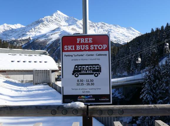 - Die Skigebiete rund um Bormio sind per Skibusservice (kostenlos für Skipassinhaber) verbunden. Somit verkehrt von Bormio ein Skibus nach Santa Caterina. Von den Unterkünften in Santa Caterina fährt ebenfalls ein Skibus zur Talstation.