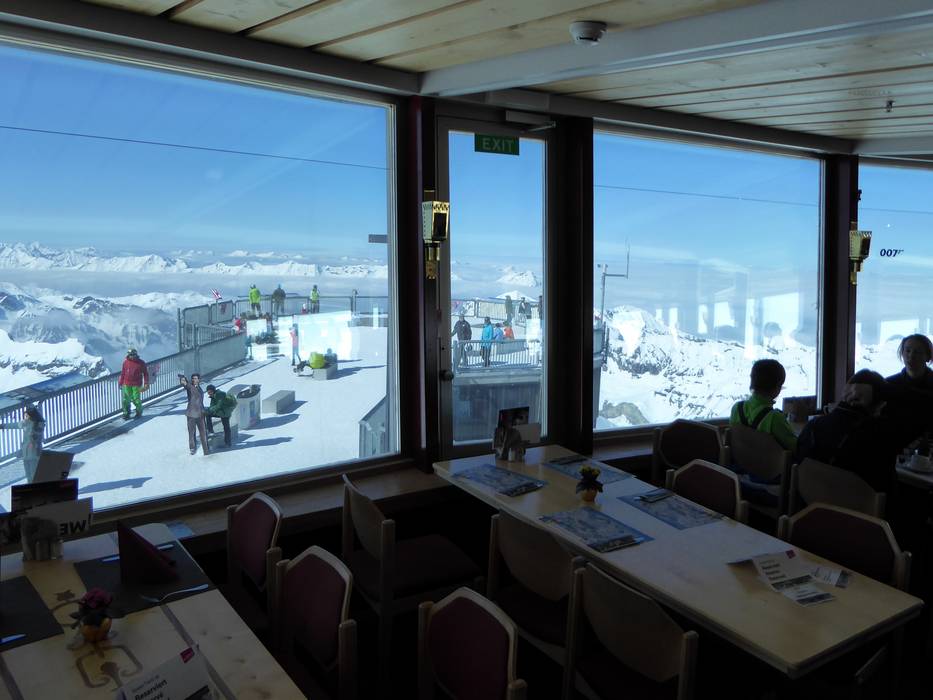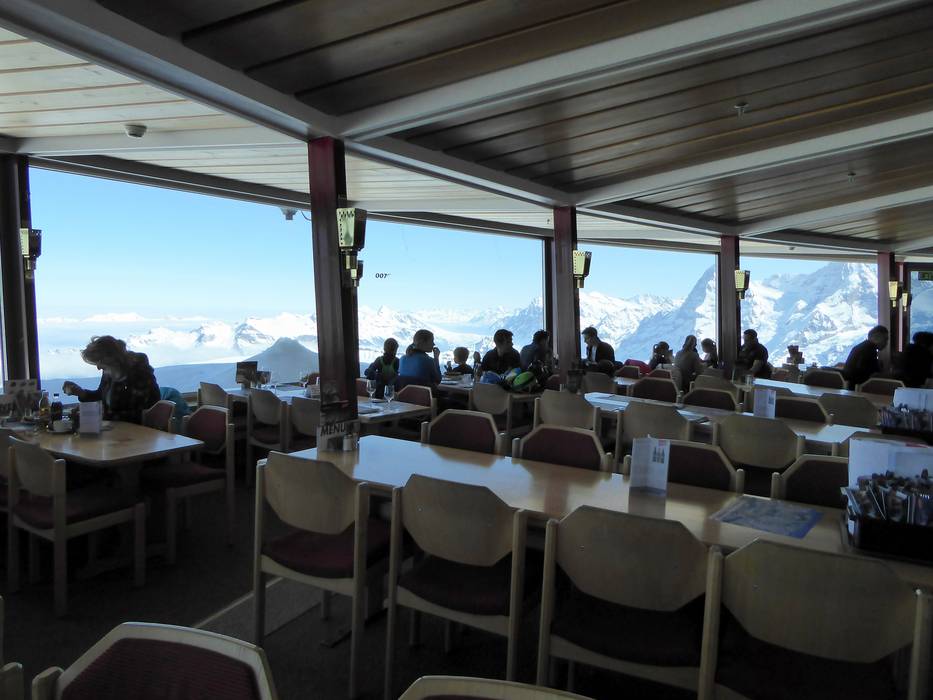 In ca. 45 Minuten dreht sich das Restaurant um die eigene Achse. Der Blick auf über 200 Bergspitzen inklusive Eiger, Mönch und Jungfrau ist spektakuläre. Das Bedienrestaurant bietet Snacks sowie regionale Gerichte und zudem täglich den beliebten James Bond Brunch.