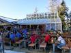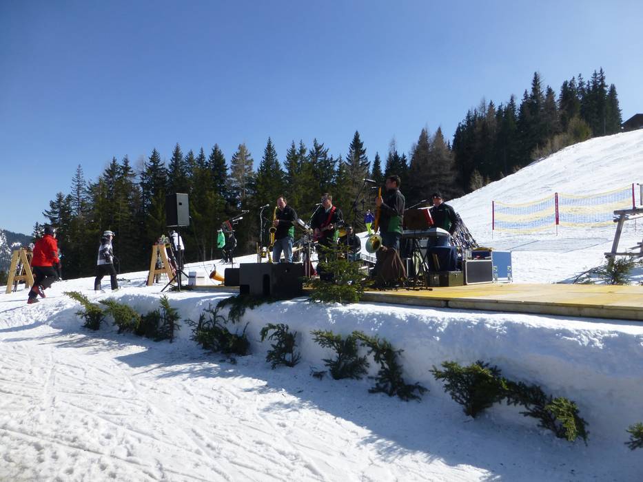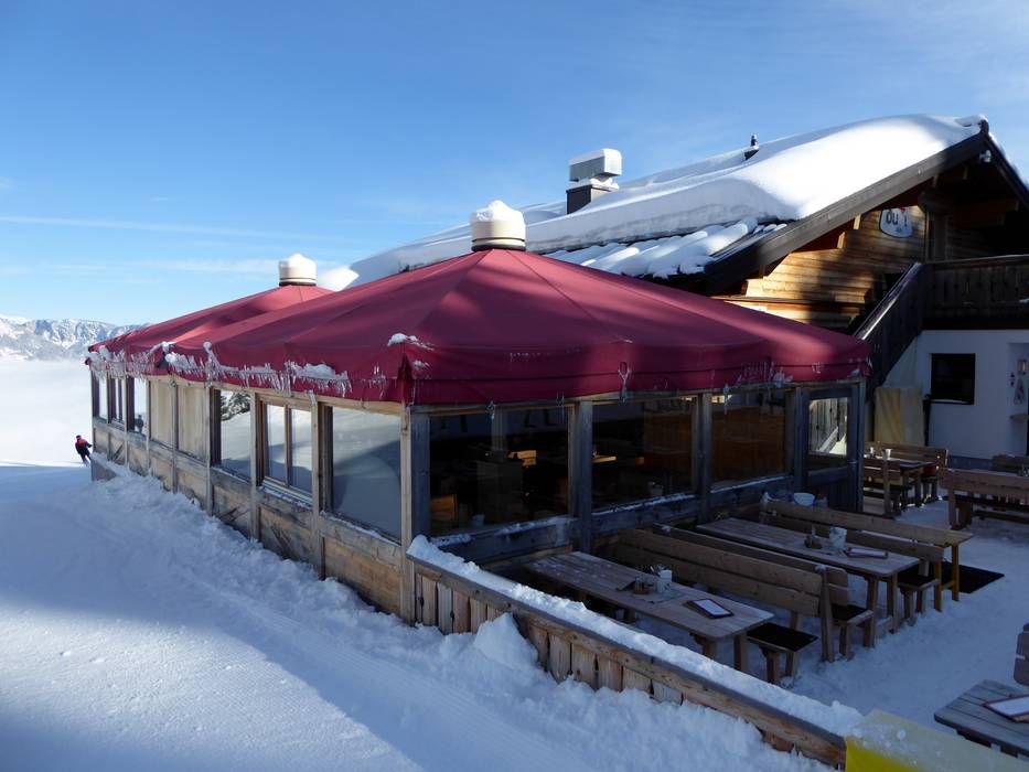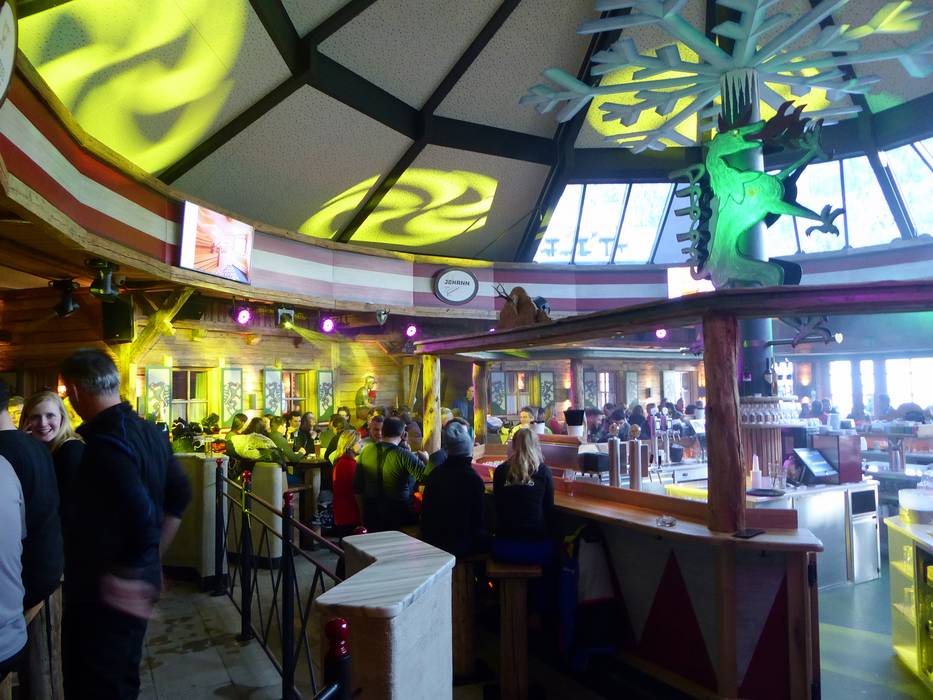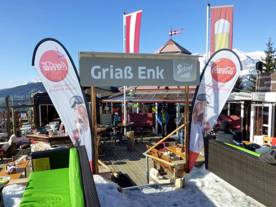 Das Open Air Pavillon der Almrausch Schirmbar ist direkt an der Bergstation des Planai 6er Seilbahn an der Ostabfahrt Piste Nr 3. Wechselnde Live-Acts und Tänzerinnen heizen die Stimmung bei der Skihaserlparty ein.