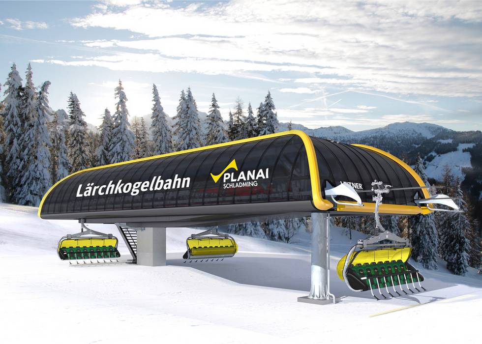Die 8er-Sesselbahn Lärchkogel ersetzt die alte Lärchkogelbahn. Die moderne Liftanlage von LEITNER bietet eine deutlich erhöhte Beförderungskapazität bei erhöhtem Fahrkomfort und verringerter Fahrzeit. Die Stationsgebäude im Pininfarina-Design nehme die typische Planai-Optik und Farbegebung auf.