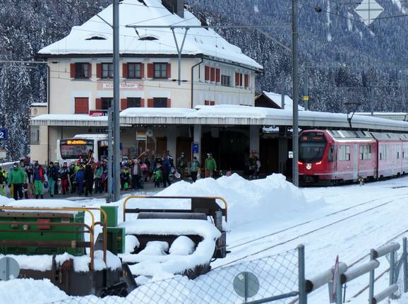 Bahnhof Scuol (Rhätische Bahn): direkter, ebenerdiger Zugang vom Bahnhof zur Talstation der Gondelbahn - Umfangreiches Skibusnetz