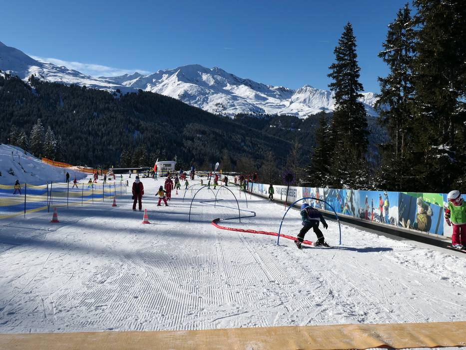 Das große Kinder- und Anfängergelände mit zwei Förderbändern und einem Tellerlift befindet sich an der Bergstation der Medrigjochbahn. Das leichte Gefälle ist für Anfänger ideal. Die Skischule See betreut die Kinder im Übungsareal und steckt auch manchmal ein Rennen aus.