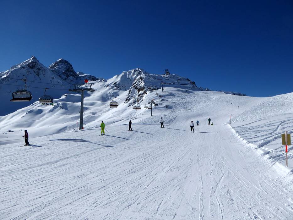 Pisten an der 8er-Sesselbahn Seebliga Breite Pisten an der Rinderhütte Blick auf Burg und Versettla