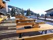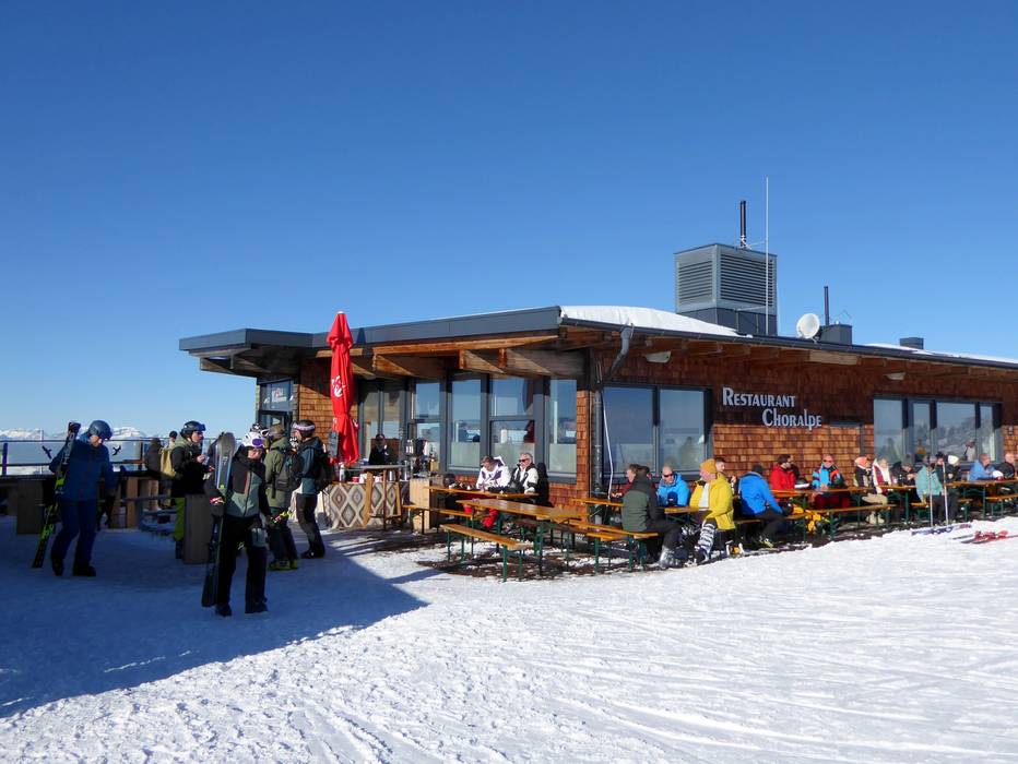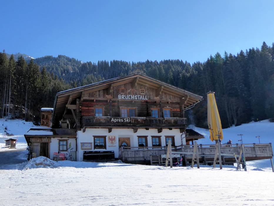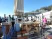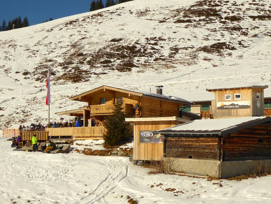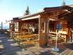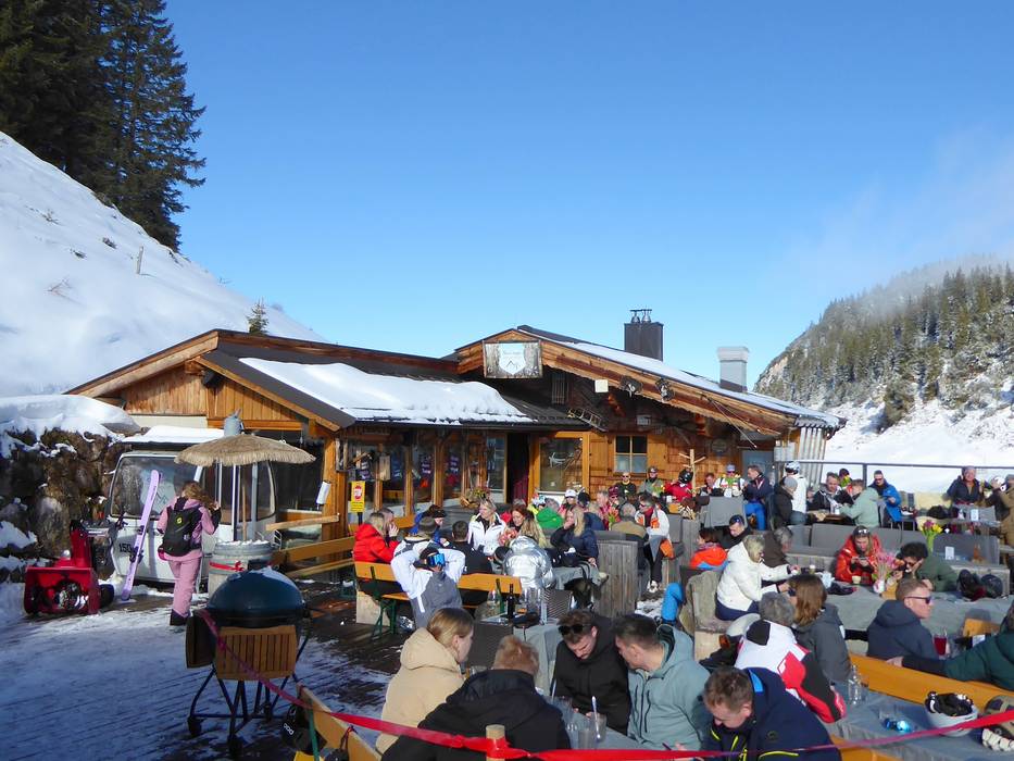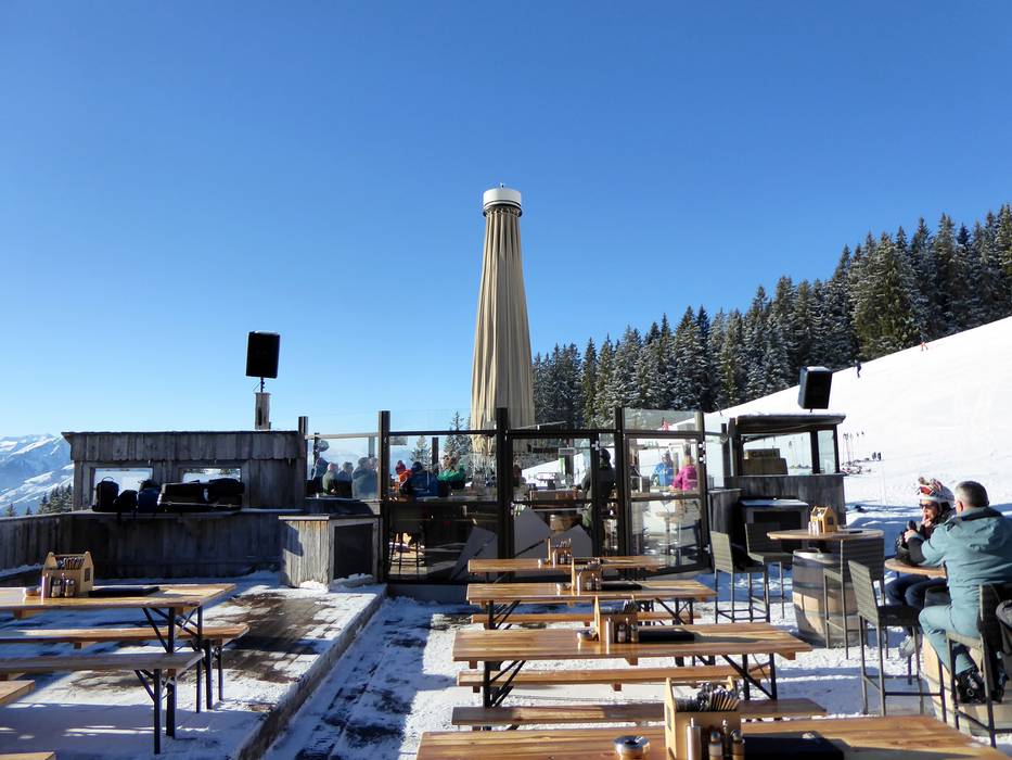 Urige Hütte mit Bar und Sonnenterrasse. Am Nachmittag geht man dann zum Après-Ski über.
