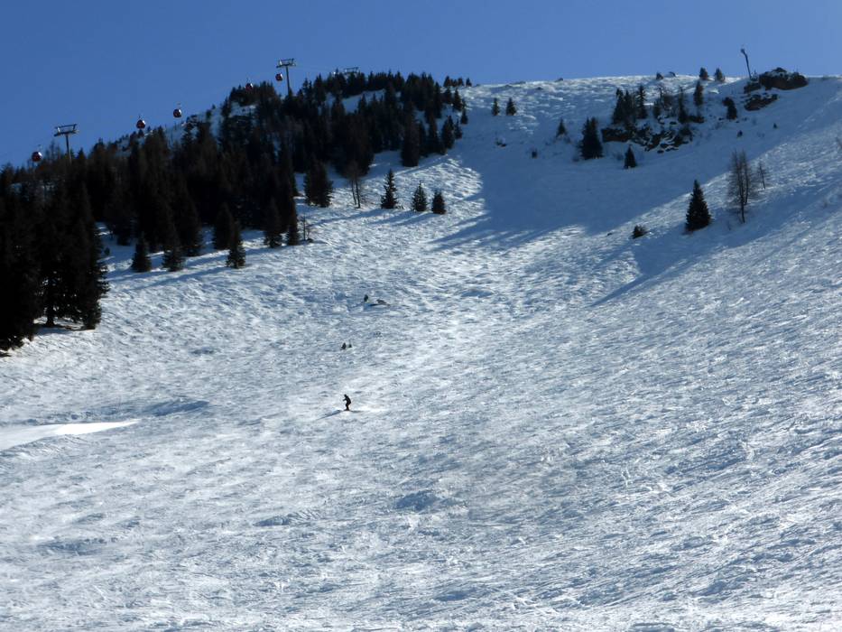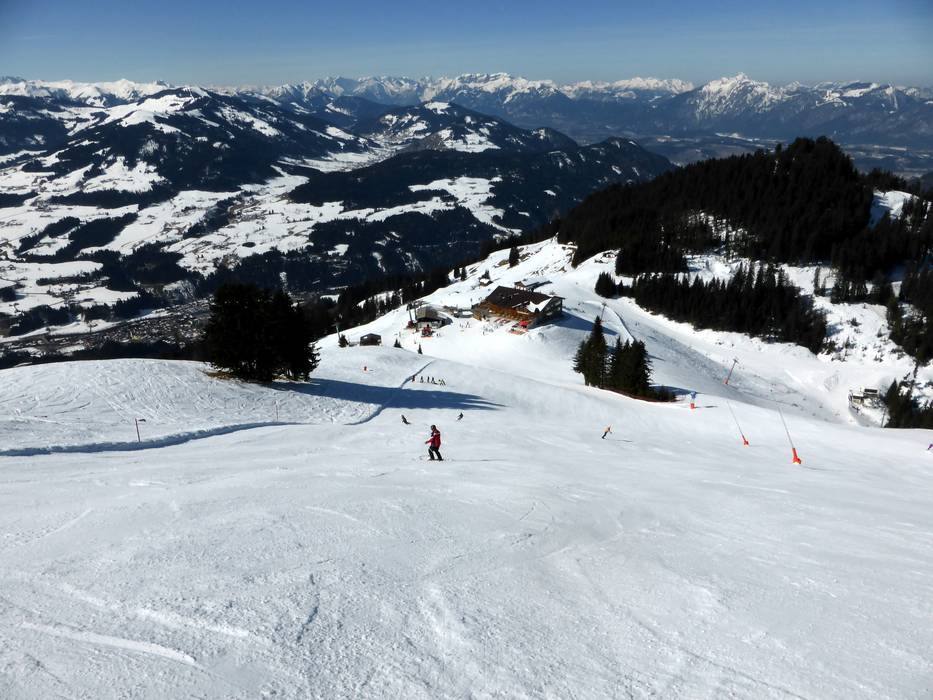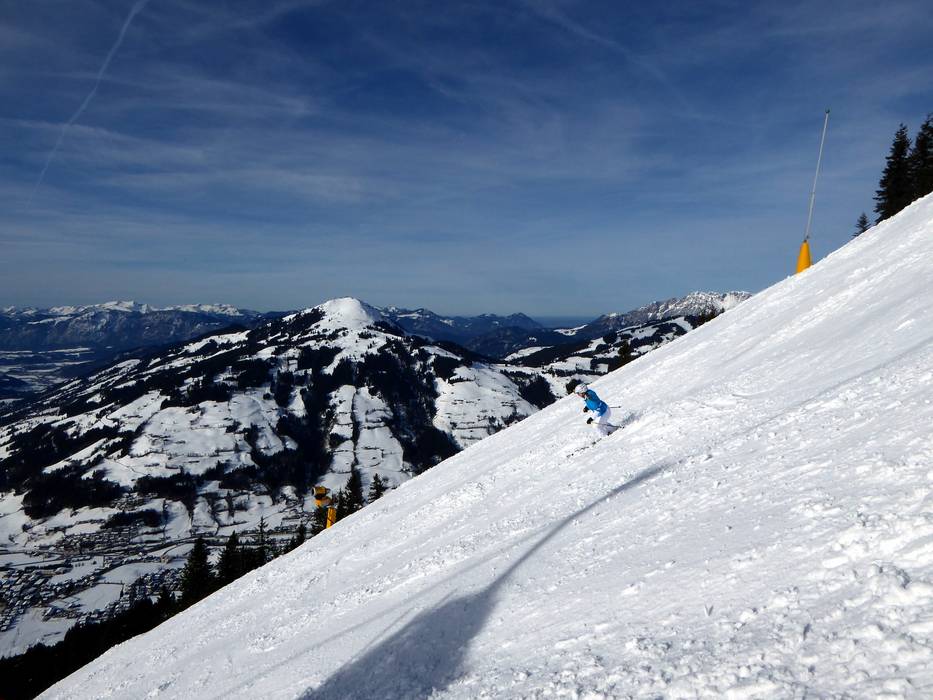 Mit 80% Gefälle geht es von der Choralpe hinunter zur Mittelstation. Es ist die steilste Piste in der SkiWelt Wilder Kaiser-Brixental.