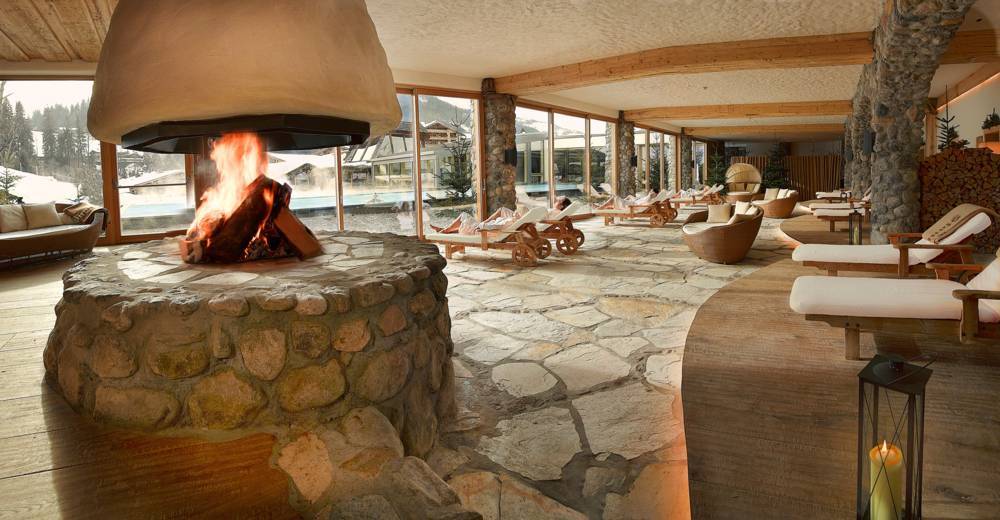 Der Wellnessbereich beeindruckt durch seine Architektur und Atmosphäre: Felsen-Hallenbad, Whirlpool mit Panoramablick, die charakteristische Felsen-Sauna mit Meerwasser-Aquarium sowie ein stilvoller Spa-Bereich mit hochwertigen Beauty- und Massageangeboten. Verwendet werden ausgewählte Produkte renommierter Marken.