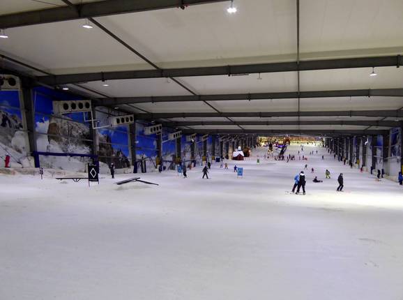 Zugang zur Skihalle Snowplanet Blick auf die Skihalle Snowplanet vom Highway… Piste mit keinem Snowpark Verleihstation in der Skihalle Snowplanet Pistenstart in der Skihalle Snowplanet