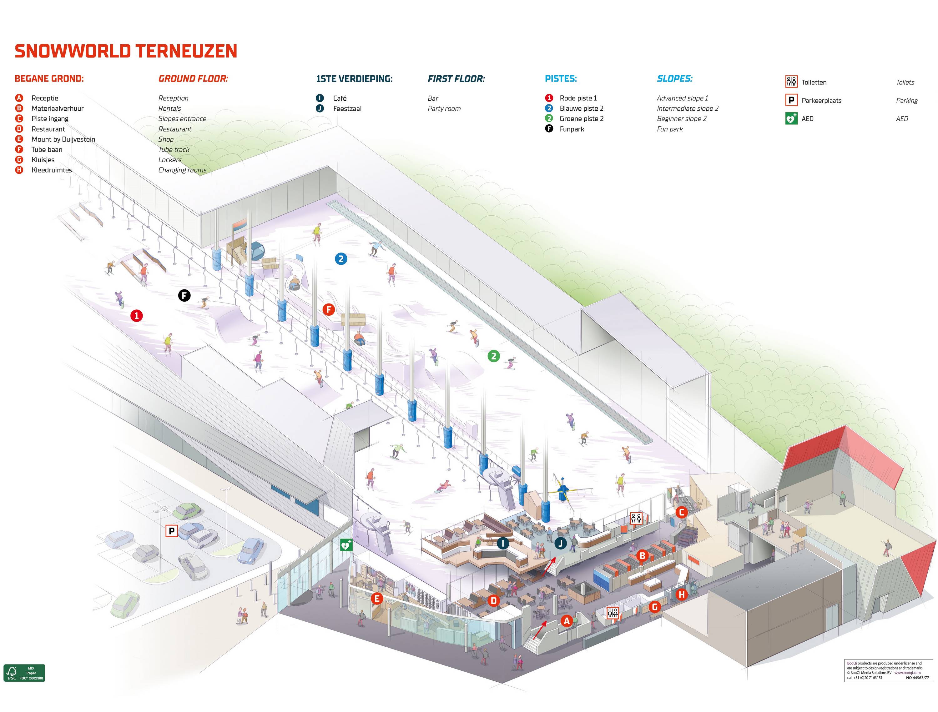 Orientierung (Pistenplan, Informationstafeln, Ausschilderung) und Sicherheit im Skigebiet SnowWorld Terneuzen