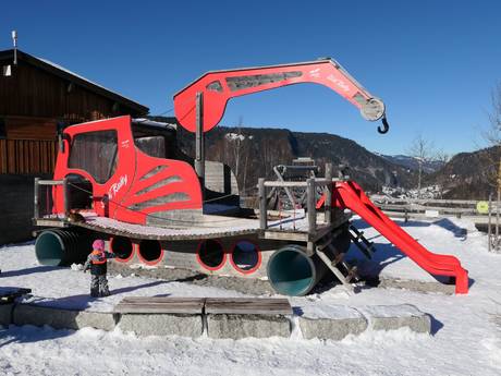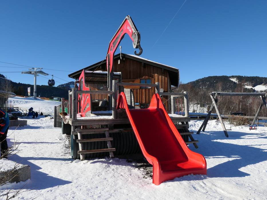 Nach dem Skifahren können Kinder eine Runde am SölliBully toben, dem hölzernen Pistenbully gleich neben Söllis Winterwelt.
