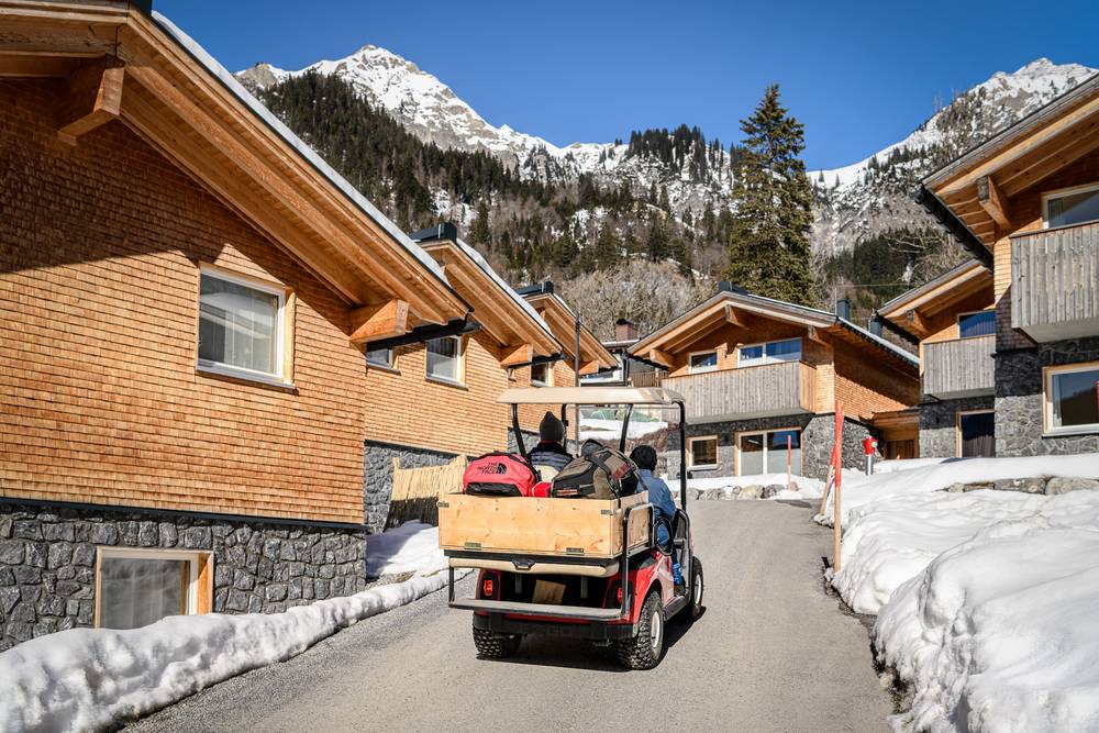 Die komplette Anlage ist autofrei und für den Gepäcktransport stehen Golfcarts zur Verfügung. Damit man vor dem powdern keinen Schnee schaufeln muss, gehört zu jeder Wohneinheit ein kostenloser Parkplatz in der Tiefgarage dazu.