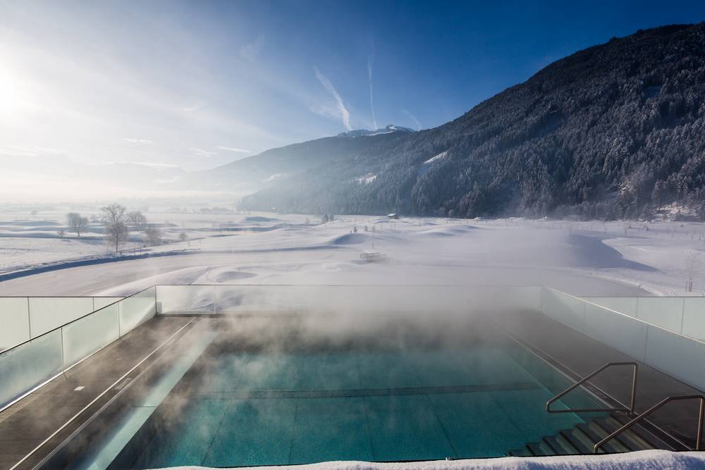 Der Wellnessbereich „Cloud 7“ befindet sich im Herzen des Hauses in der ersten Etage. Die Saunalandschaft bietet eine finnische Sauna, Bio-Sauna und Dampfbad. Behandlungen und Massagen können hier direkt an der Wellness Rezeption gebucht werden. Highlight ist der beheizte Infinity Pool auf dem Dach des Hauses. Vom Infinity Pool aus hat man einen atemberaubenden Blick hinein in das Zillertal und auf die umliegenden Berge. Großzügige Ruhezonen mit Panoramafenstern stehen in der ersten Etage und in der zweite Etage auf dem Dach zur Verfügung. Hier befindet sich auch die Sonnenterrasse.