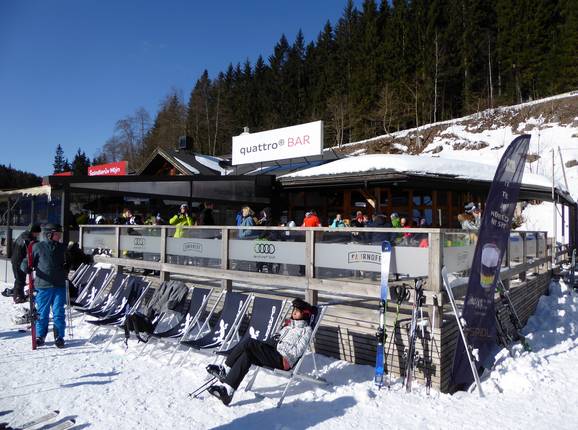 Die Audi quattro® BAR ist eine moderne und luxuriöse Bar am Fuße der Skipisten. Hier kann man den Skitag optimal ausklingen lassen. Am offenen Feuer genießt man seine Getränke mit direktem Blick auf die Pisten. Zwischen 15.00 Uhr und 17.00 Uhr lockt die Happy Hour. An den Wochenenden legt ein DJ bereits ab 11.00 Uhr auf.