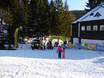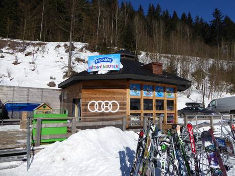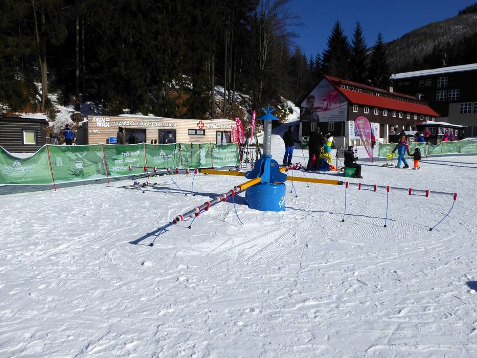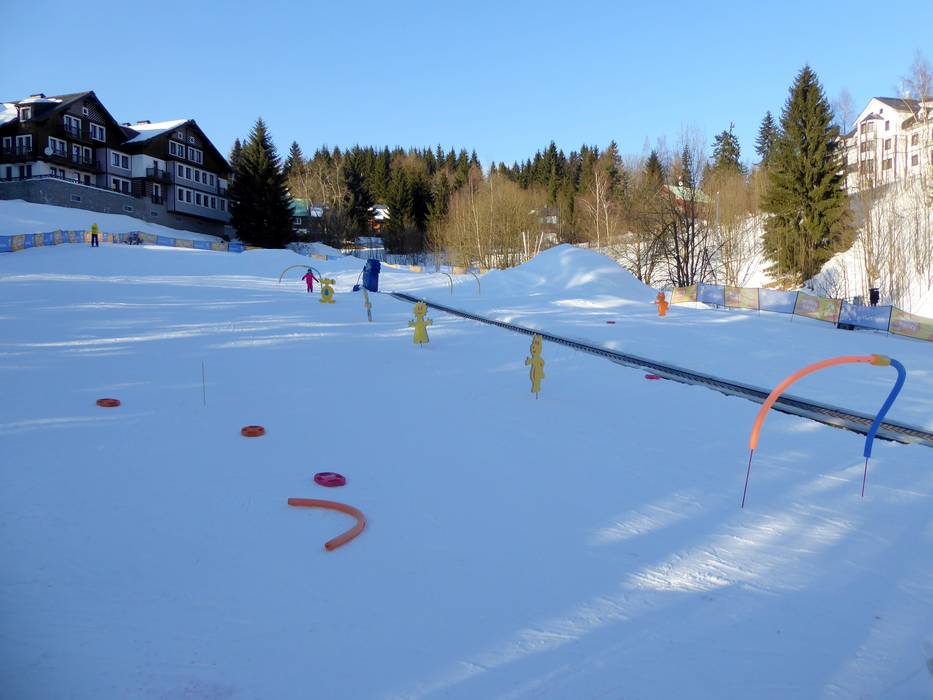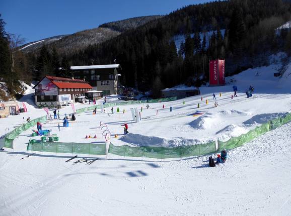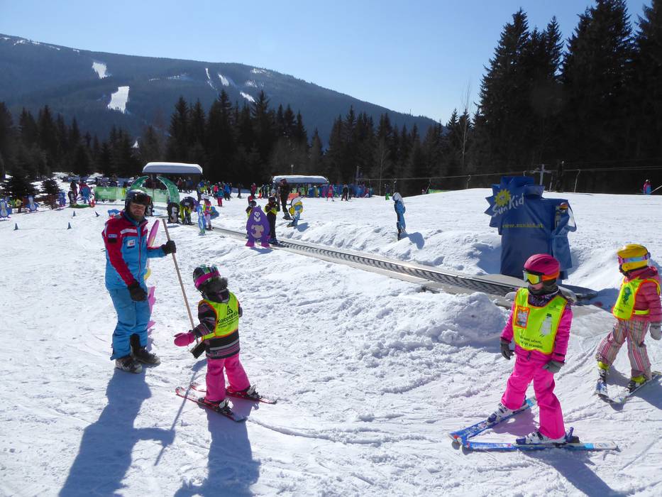 Direkt an der Talstation Medvědín befindet sich das Kinderland der Skischule Skol Max. An einem Förderband können die Kleinen die ersten Schwünge im Schnee üben.