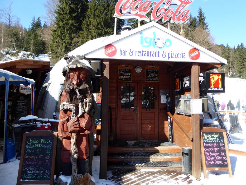 Die Igloobar bietet tschechische Spezialitäten und hausgemachte Pizzen. In der urigen Stube oder auf der beheizten Terrasse kann man verweilen. Am Nachmittag locken Kaffeespezialitäten und Kuchen.