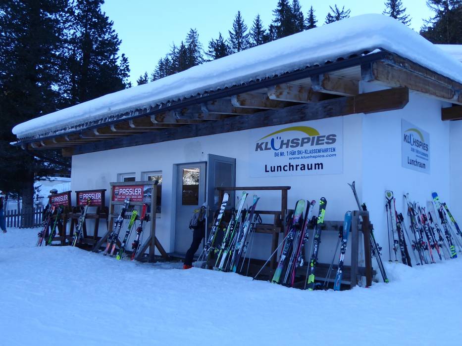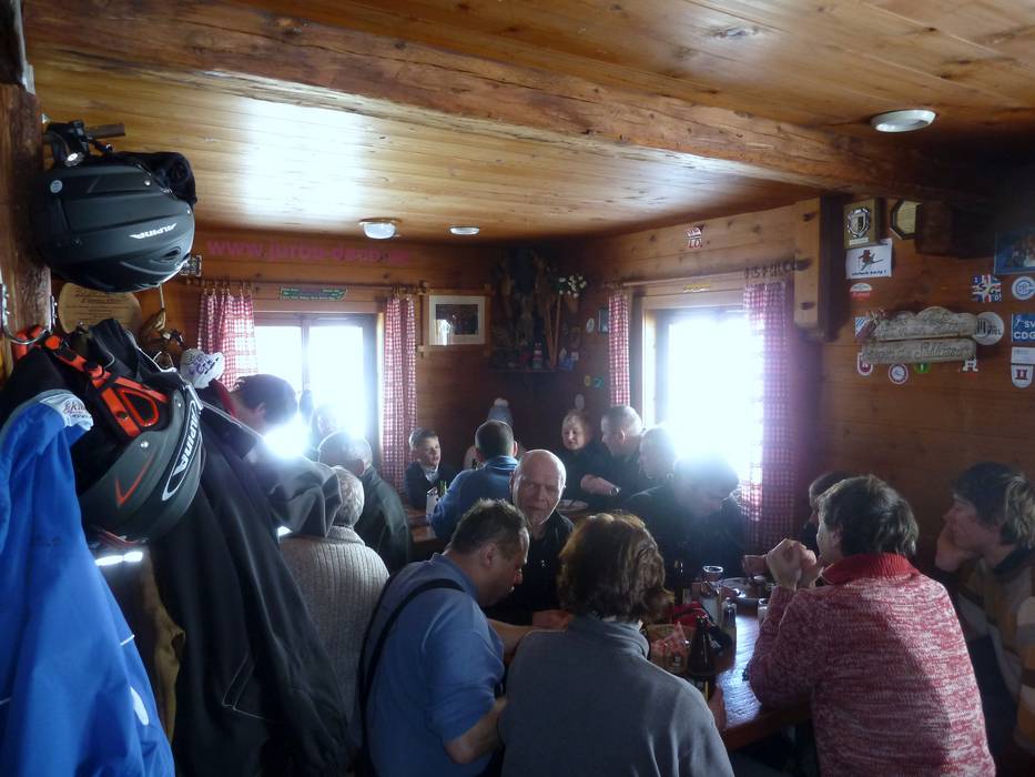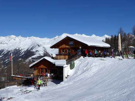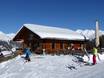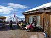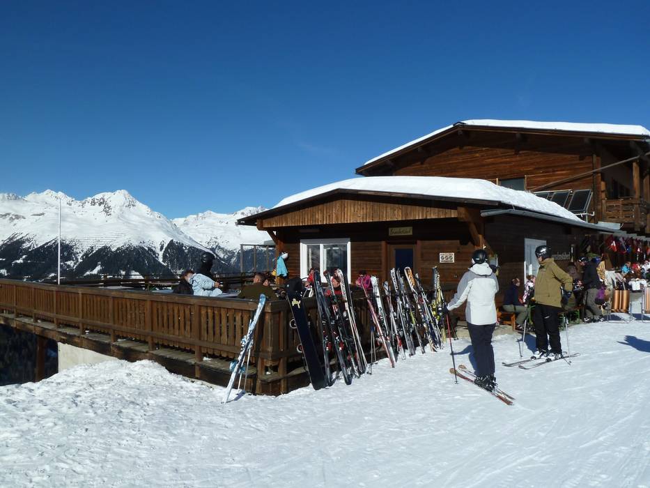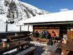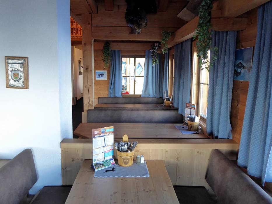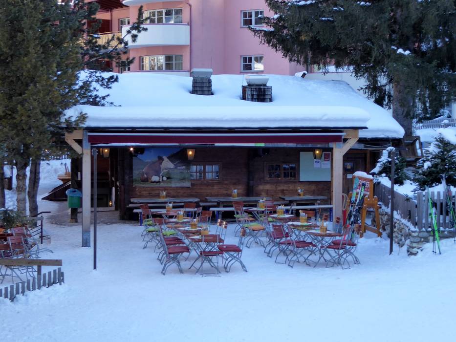 Die gemütliche Skihütte hat zwei Bereiche. Im Obergeschoss gibt es eine Bar mit Sonnenterrasse, unten ein Restaurant ebenfalls mit einer Sonnenterrasse.